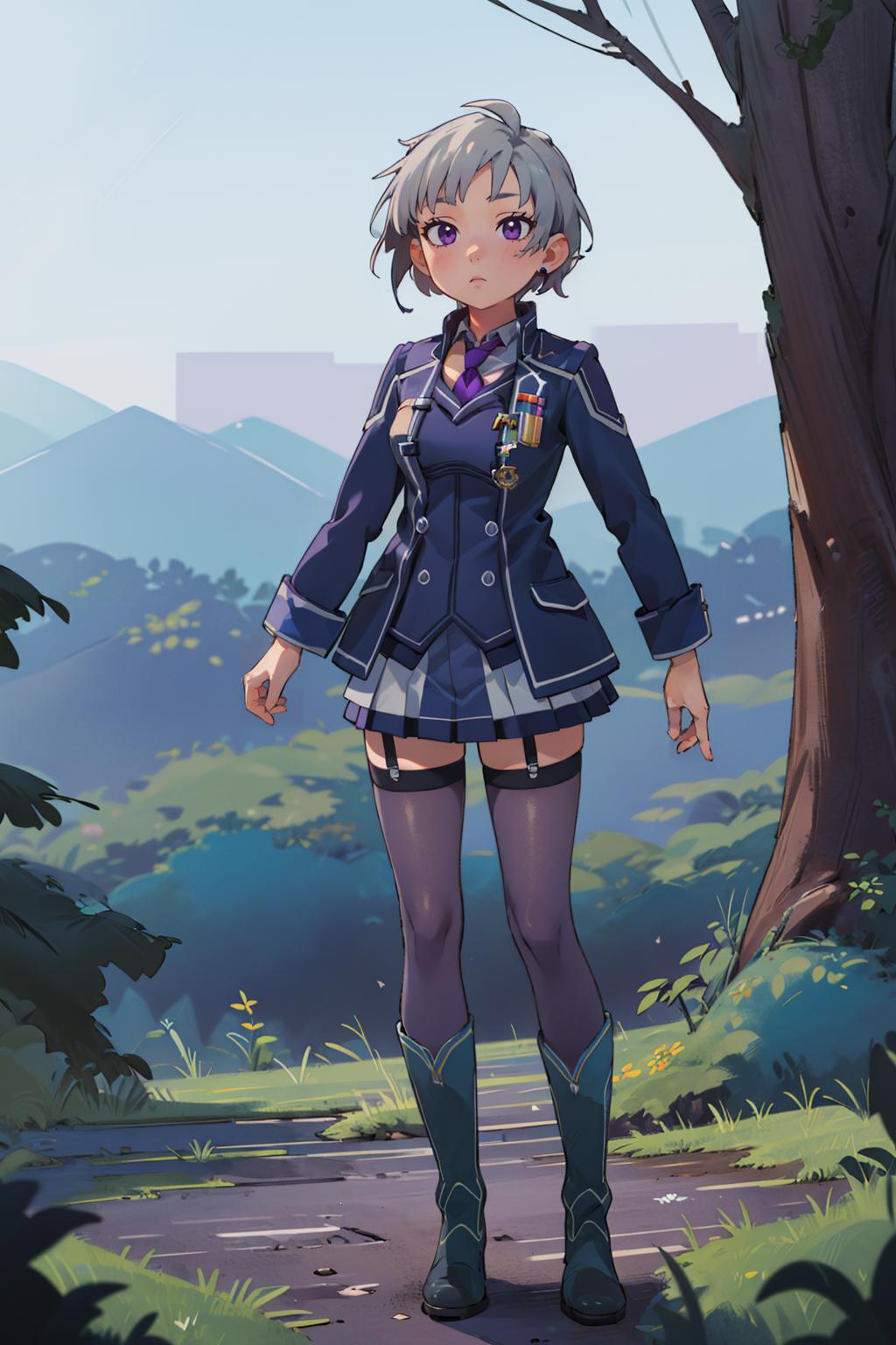 blue uniform, long sleeves, purple neckwear, black thighhighs, garter straps, boots,