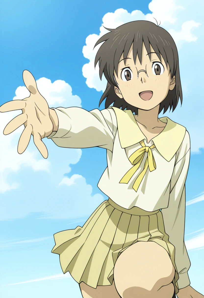 wide yellow collar,white shirt,yellow ribbon tie,long sleeves,collarbone,yellow pleated skirt