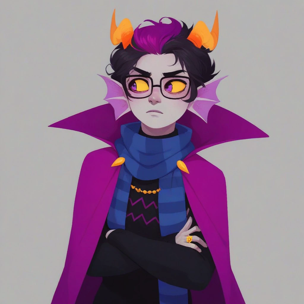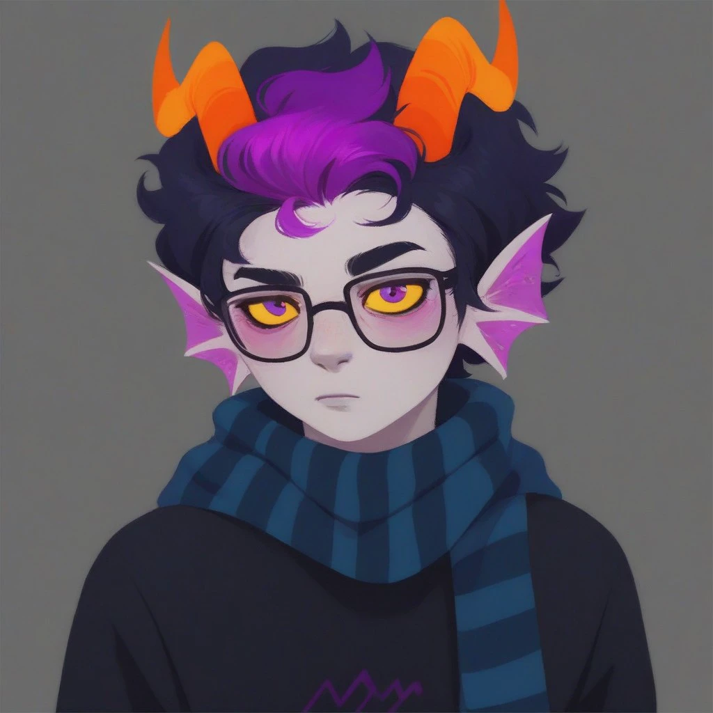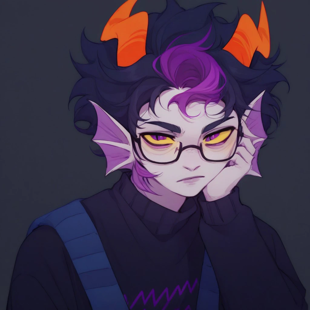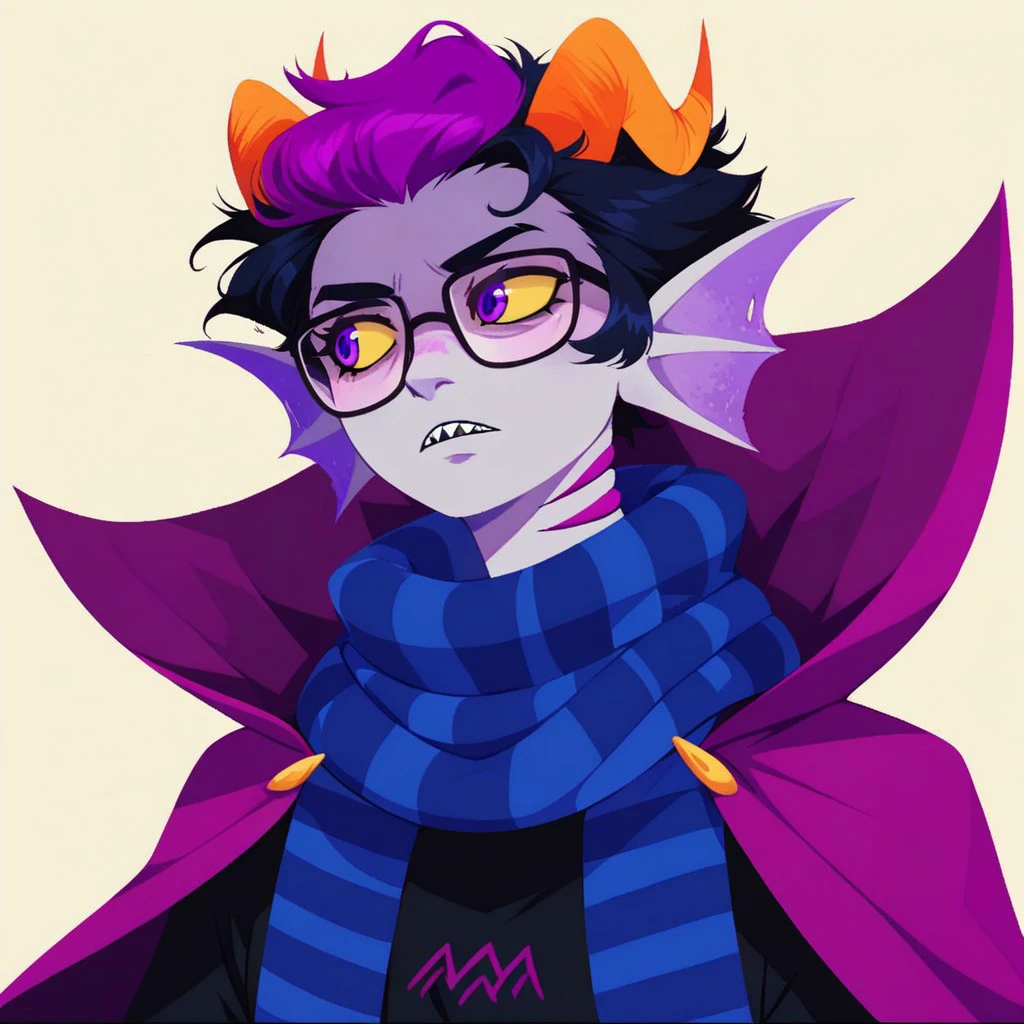 Eridan Ampora, 1boy, head fins, gills, sharp teeth, wavy horns, horns, black hair, short hair, violet stripe in hair, yellow sclera, violet eyes, gray skin, colored skin,