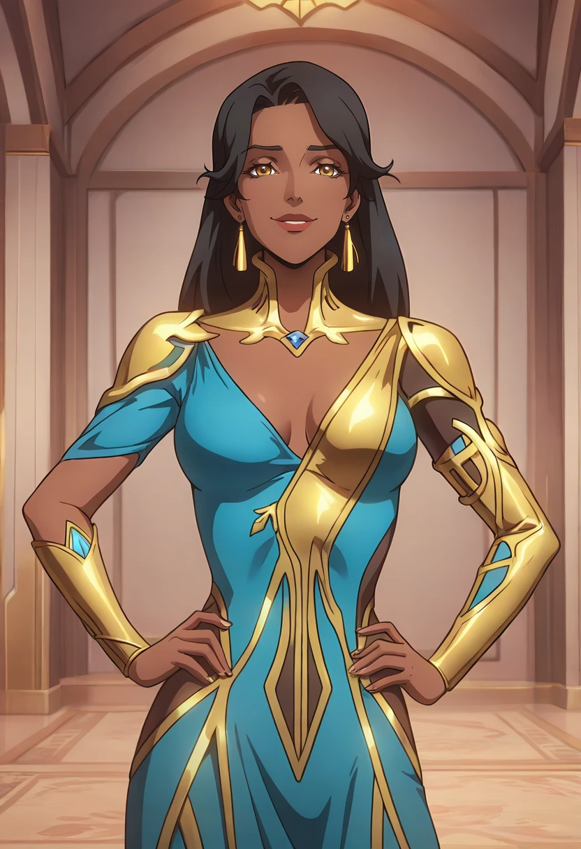 outfit 2 trigger : dark blue dress, puffy sleeves, long sleeves, gloves, high collar, cleavage, breasts apart, crown, brooch, red gem