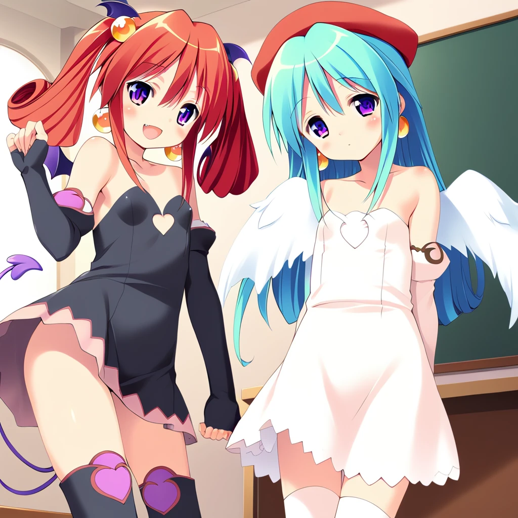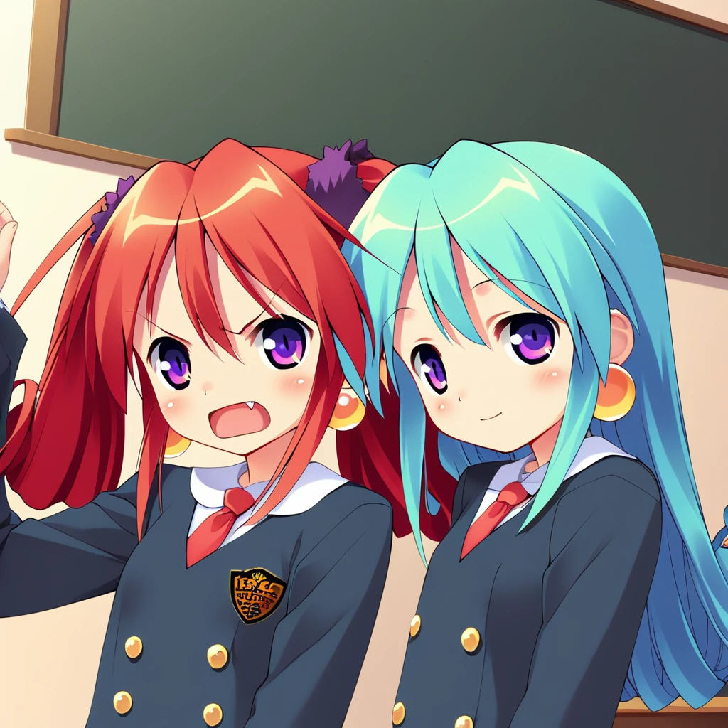 niihonoka, purple eyes, red hair, long hair, twintails, earrings, jewelry, hair ornament