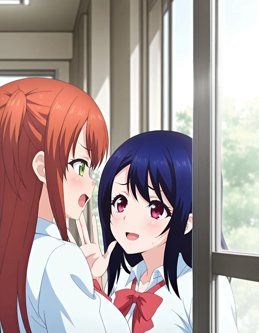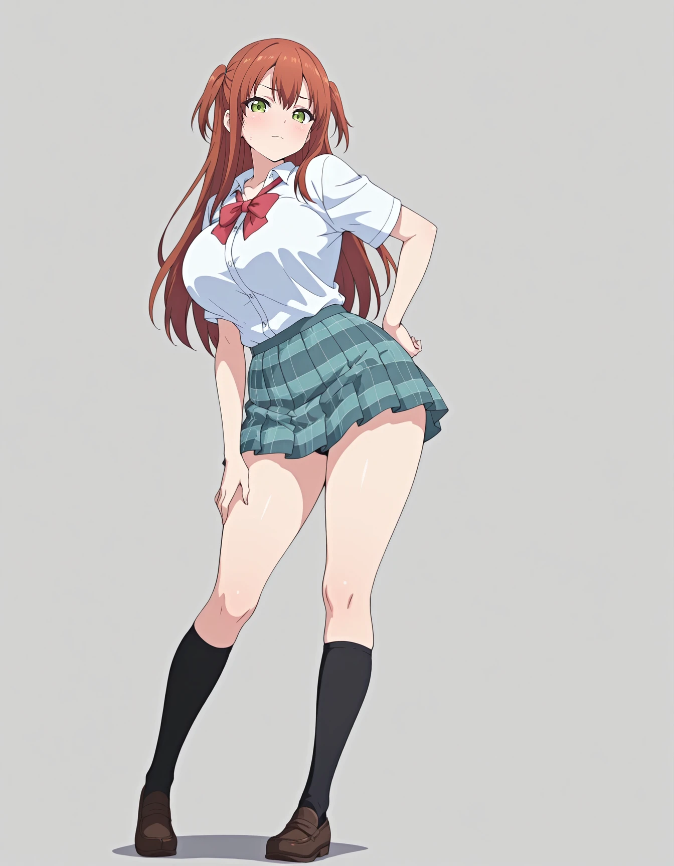 mai_nok,mai_youkonk,long_hair,orange_hair,green_eyes,two_side_up,large_breasts,school_uniform,bow,white_shirt,plaid_skirt,black_kneehighs,loafers