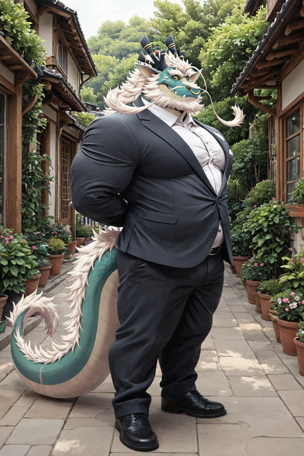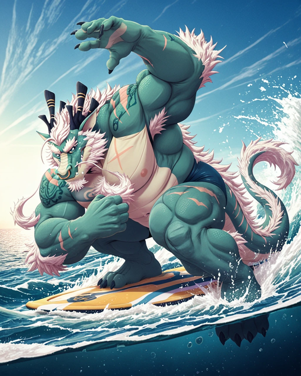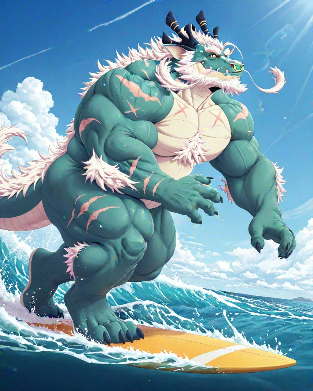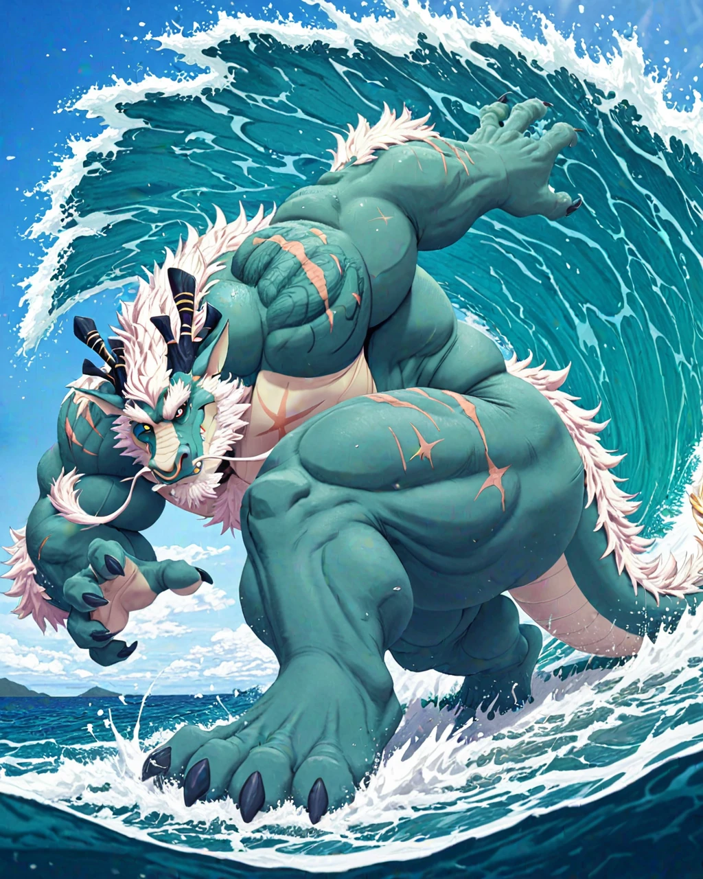 Xiaolong, Dragon, musclegut, green scales, yellow eyes, long fluffy mane, white hair, scars, nose ring, dark blue horns, fangs, claws, tail, nude, thick thighs