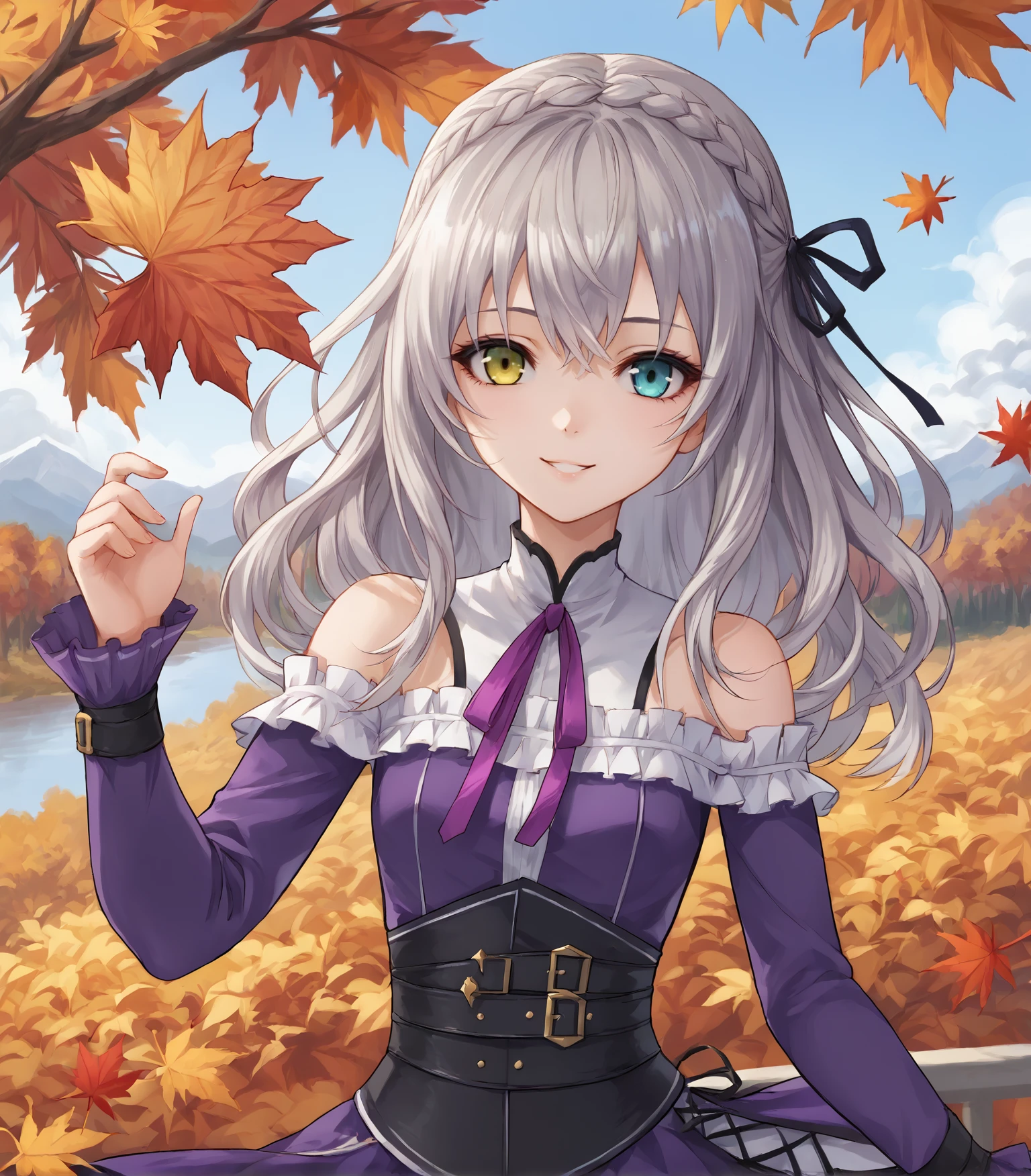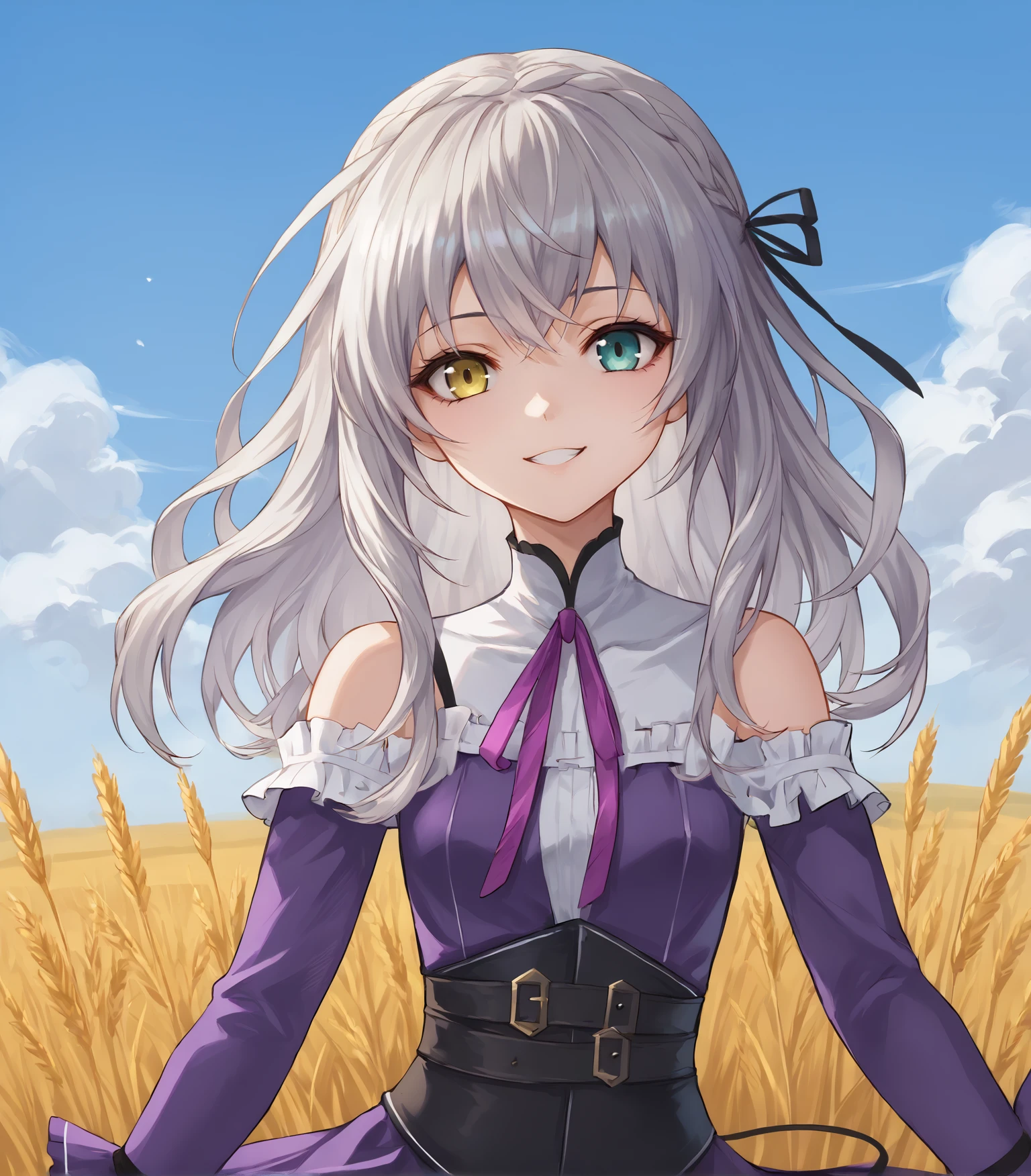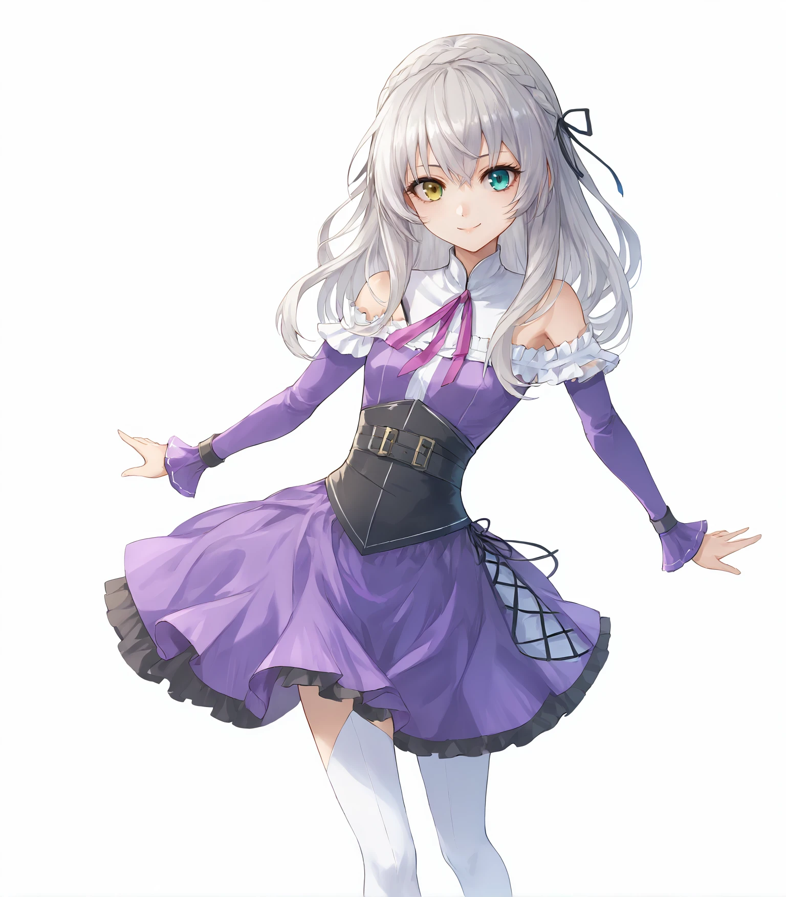 <lora:LapisRosenbergKai:0.9>, Lapis Rosenberg, grey hair, long hair, braid, black ribbon, heterochromia, yellow and aqua eyes, small breasts, purple dress, detached sleeves, bare shoulders, white collar, purple ribbon, black corset, white thighhighs, mary janes,