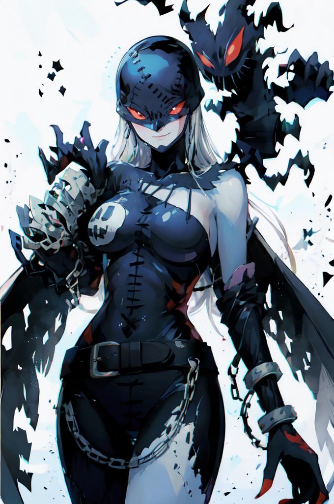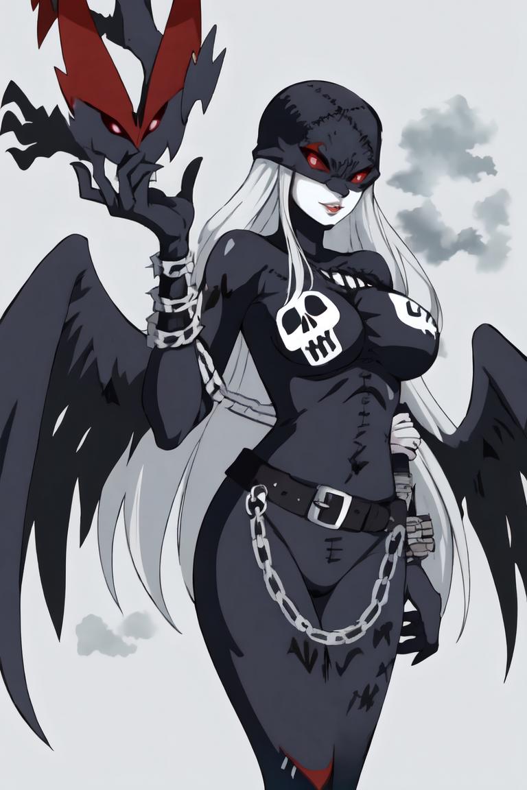 BODY PROMPTSlong hair, red eyes, breasts, digimon \(creature\), mask, large breasts, colored skin, white hair, very long hair, black wings, lipstick, red lips, tall female,