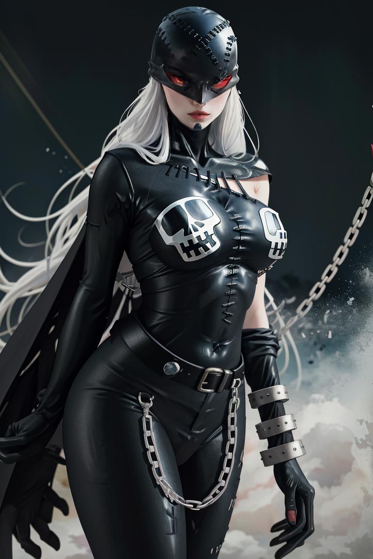 OUTFIT PROMPTSbodysuit, chain, collar, belt, claws, cuffs, wings, shackles, gloves, chained, handcuffs, broken chain, spikes, asymmetrical clothes, skull print,
