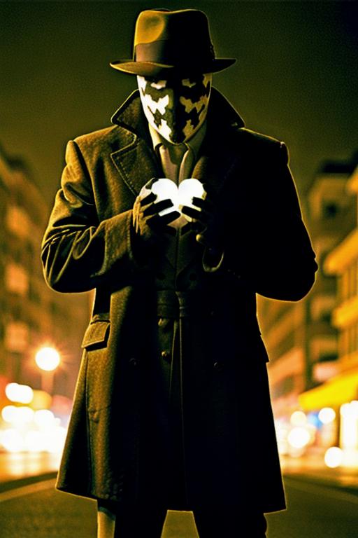 Prompt : Rorschach, realistic, natural lighting, post-processing, ultra realistic, highly detailed, very detailed, cinematic, hyper realistic, intricate scenery, sharp, photo by Annie Leibovitz, film, studio lighting, ultra realistic, bokeh, sharp features <lora:Rorschach:0.7>