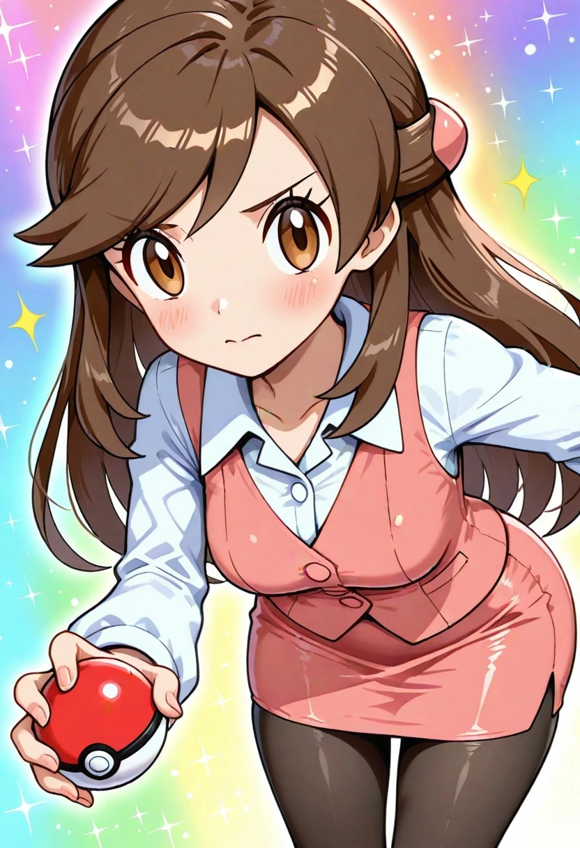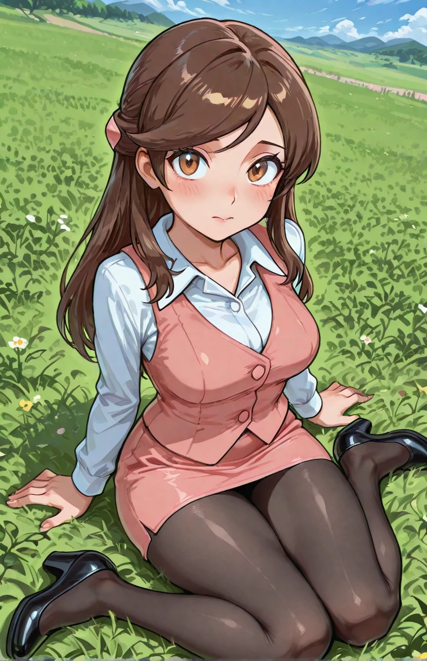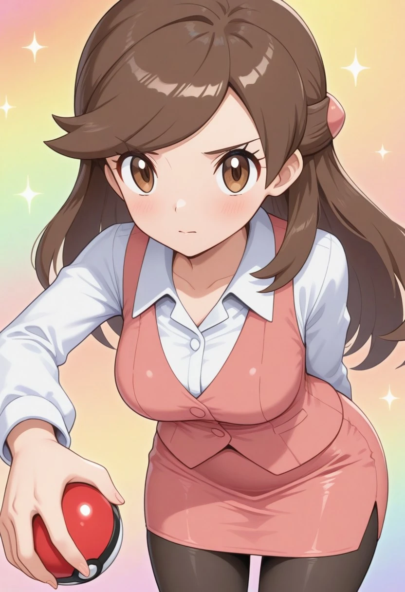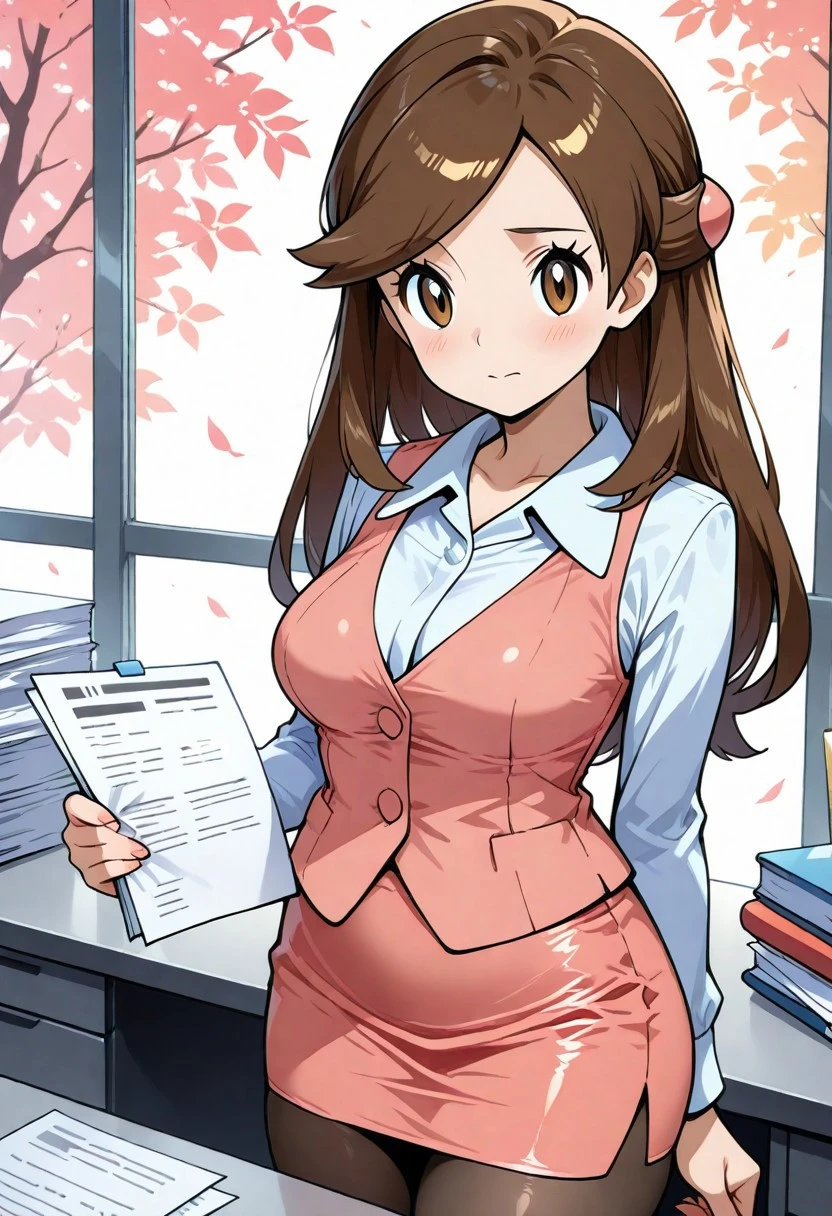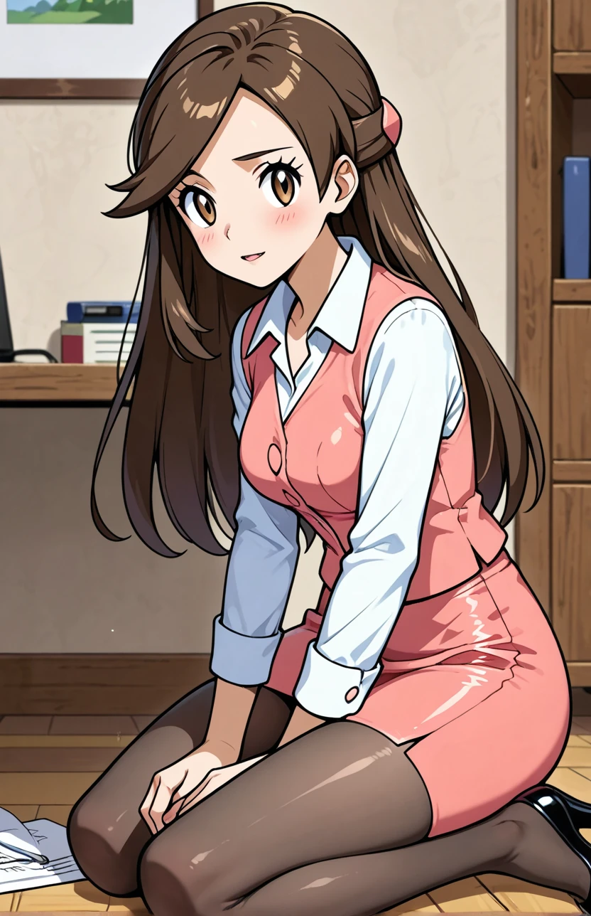 olbw, office worker \(pokemon\), brown eyes, long hair, brown hair, hair ornament, half updo, pink vest, white shirt, collared shirt, long sleeves, pink skirt, black pantyhose, high heels, black footwear