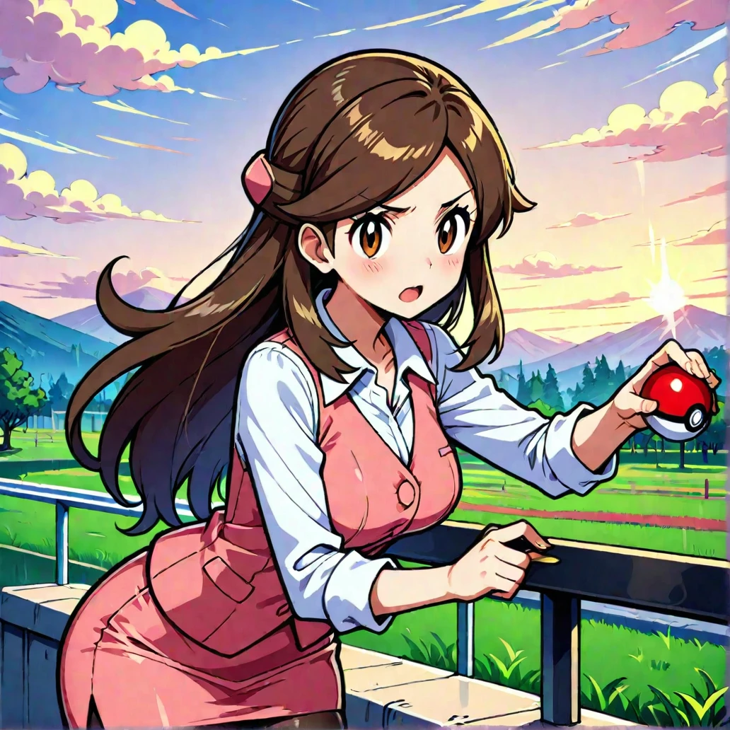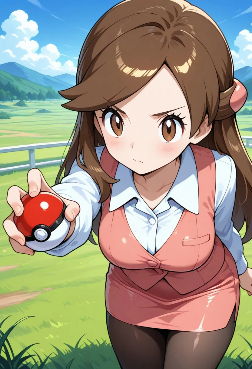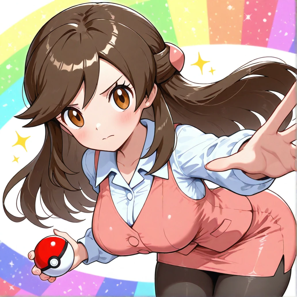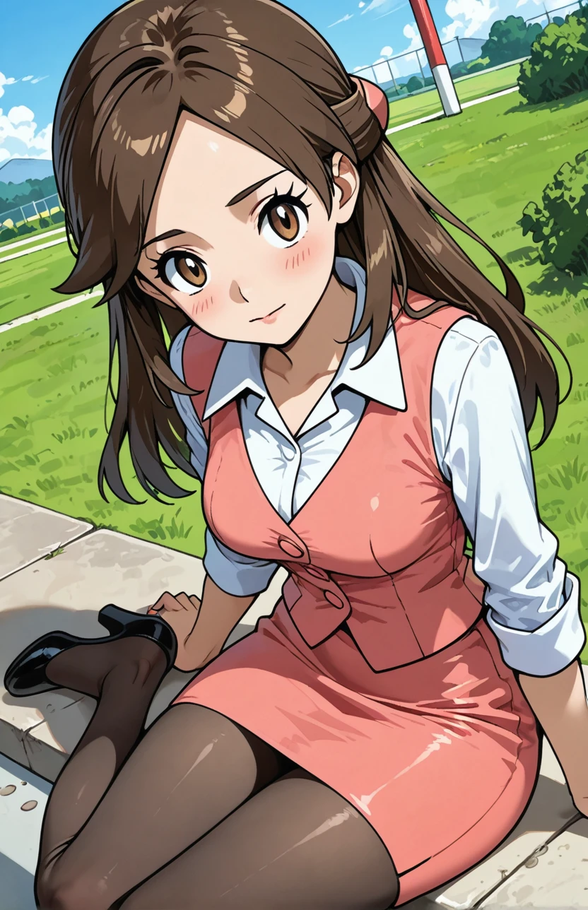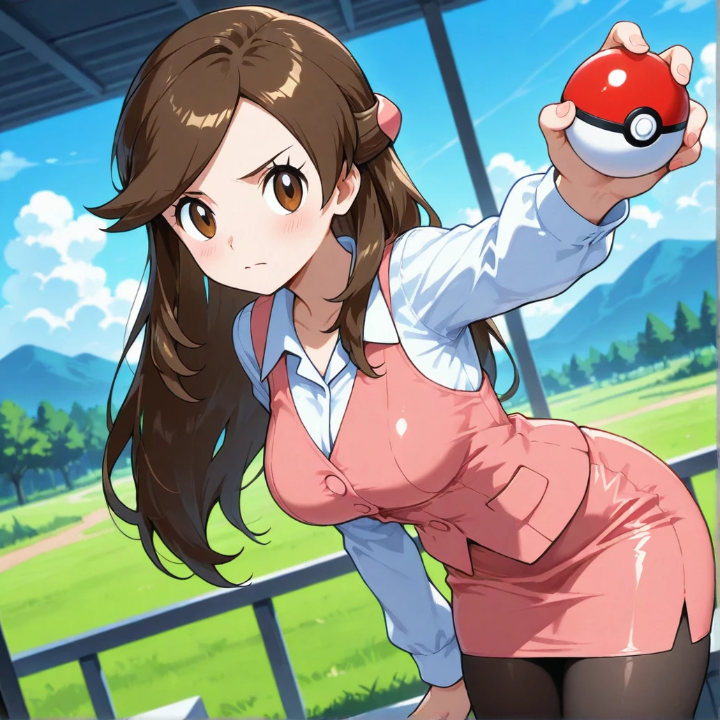 olbw, office worker \(pokemon\), brown eyes, long hair, brown hair, hair ornament, half updo, pink vest, white shirt, collared shirt, long sleeves, pink skirt, black pantyhose, high heels, black footwear