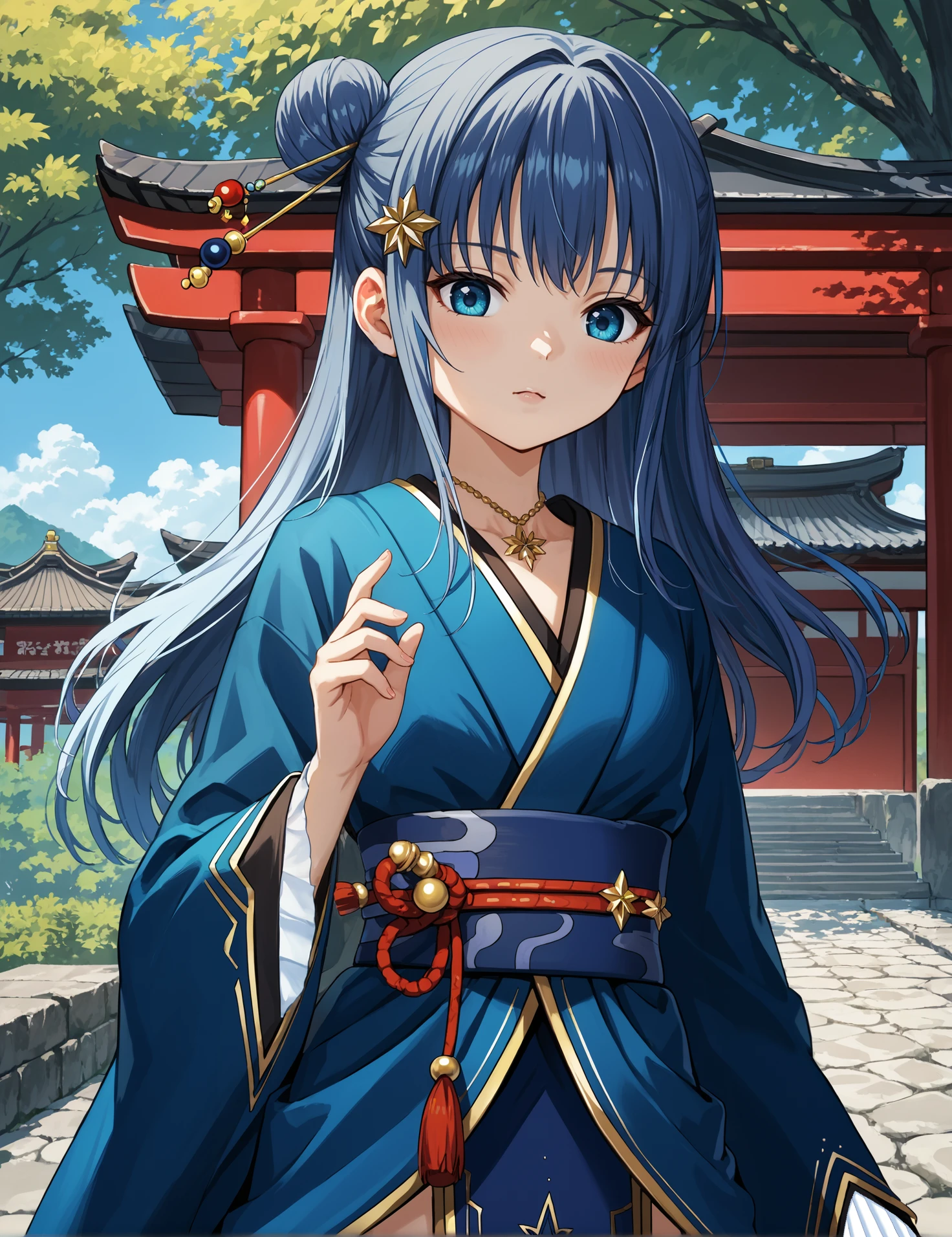 Ceremonial outfit: mgrcyachioutfits, nmocmn, long hair, side bun, gold hair needles, gold hairpin, gold necklace, blue yukata, blue obi, red obijime, white frills, blue loincloth, blue thighhighs
