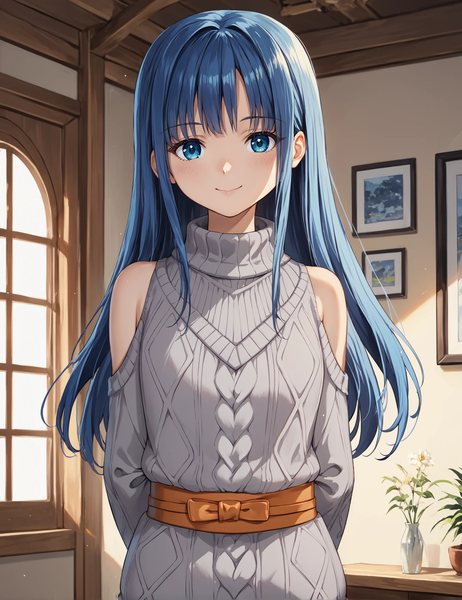 Winter outfit: mgrcyachioutfits, nmowtr, long hair, grey sweater, shoulder cutout, orange belt with bow, black pantyhose