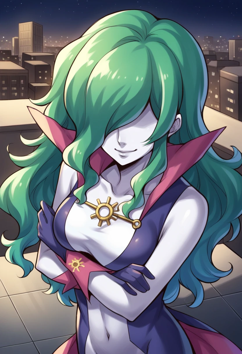 viviansmt, very long hair, green hair, hair over eyes, colored skin, bolero, collar, shoes, gloves,