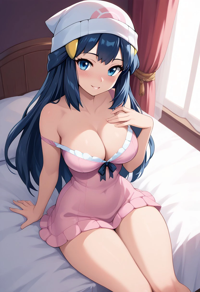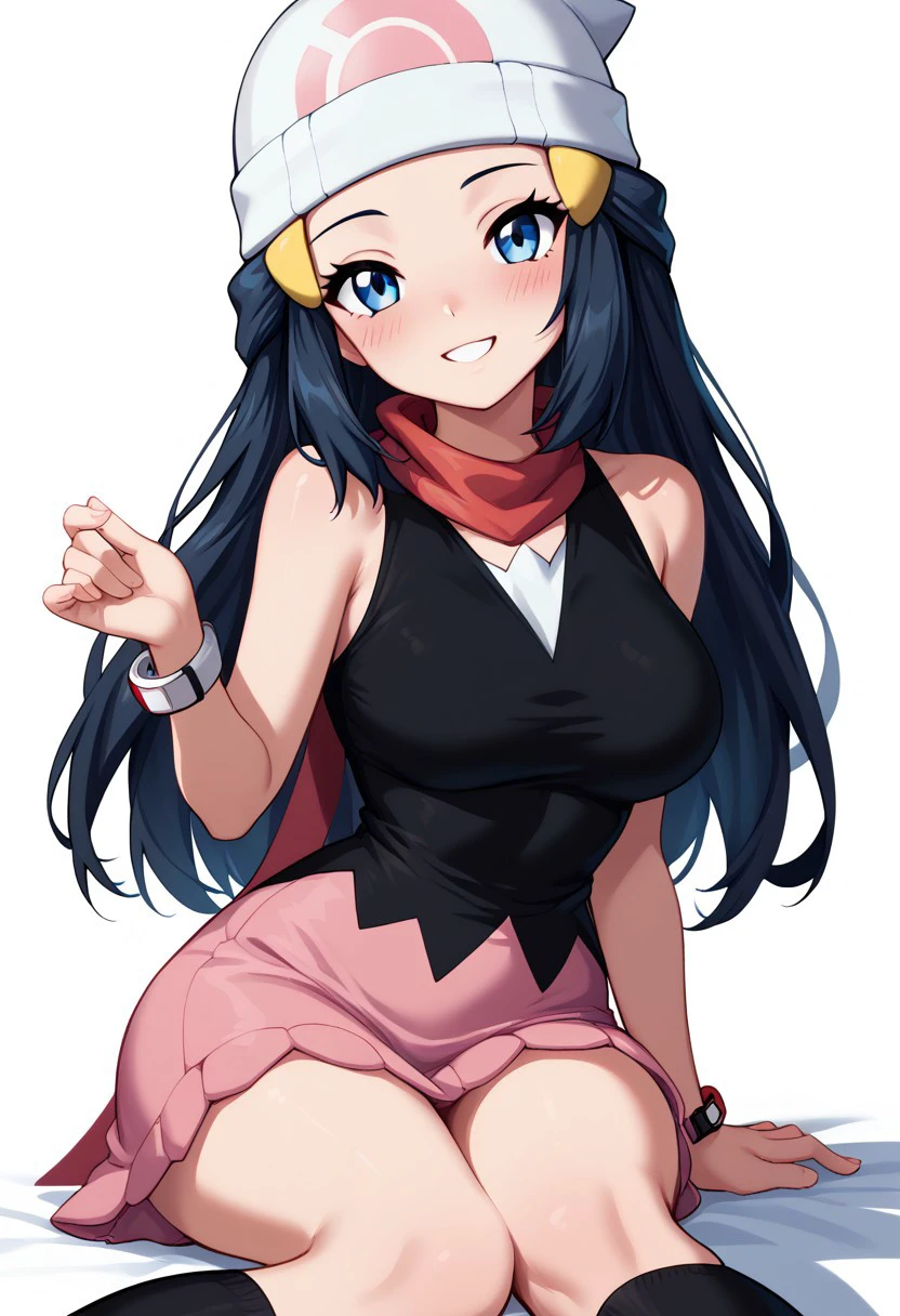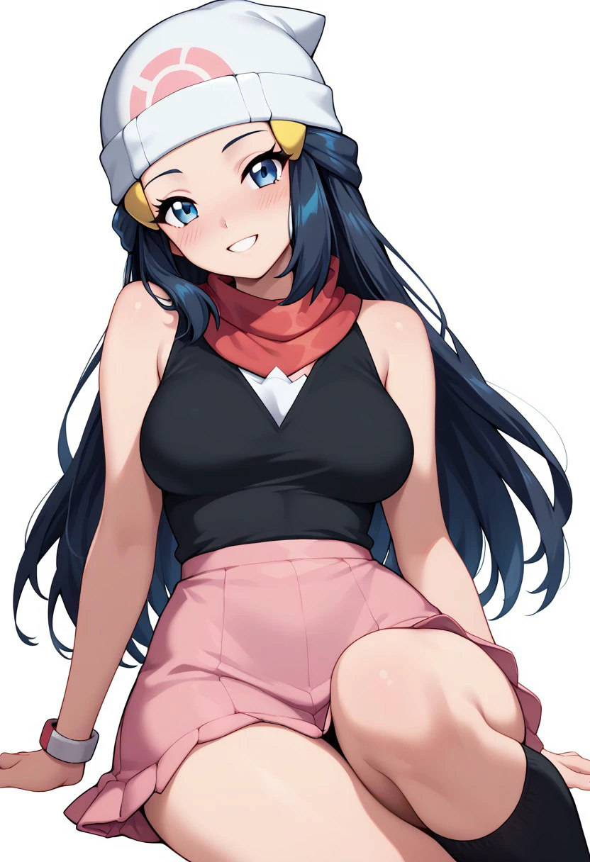 patDawn, dawn (pokemon), black hair, blue eyes, sidelocks, long hair, bare shoulders, beanie, black shirt, black socks, bracelet, kneehighs, pink skirt, red scarf, shirt, sleeveless shirt, white headwear,