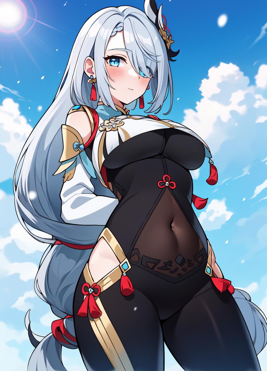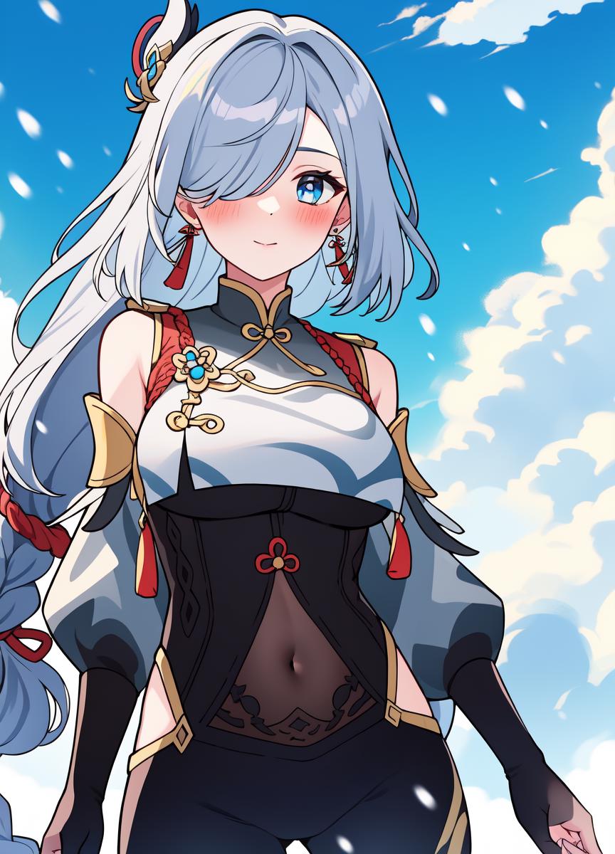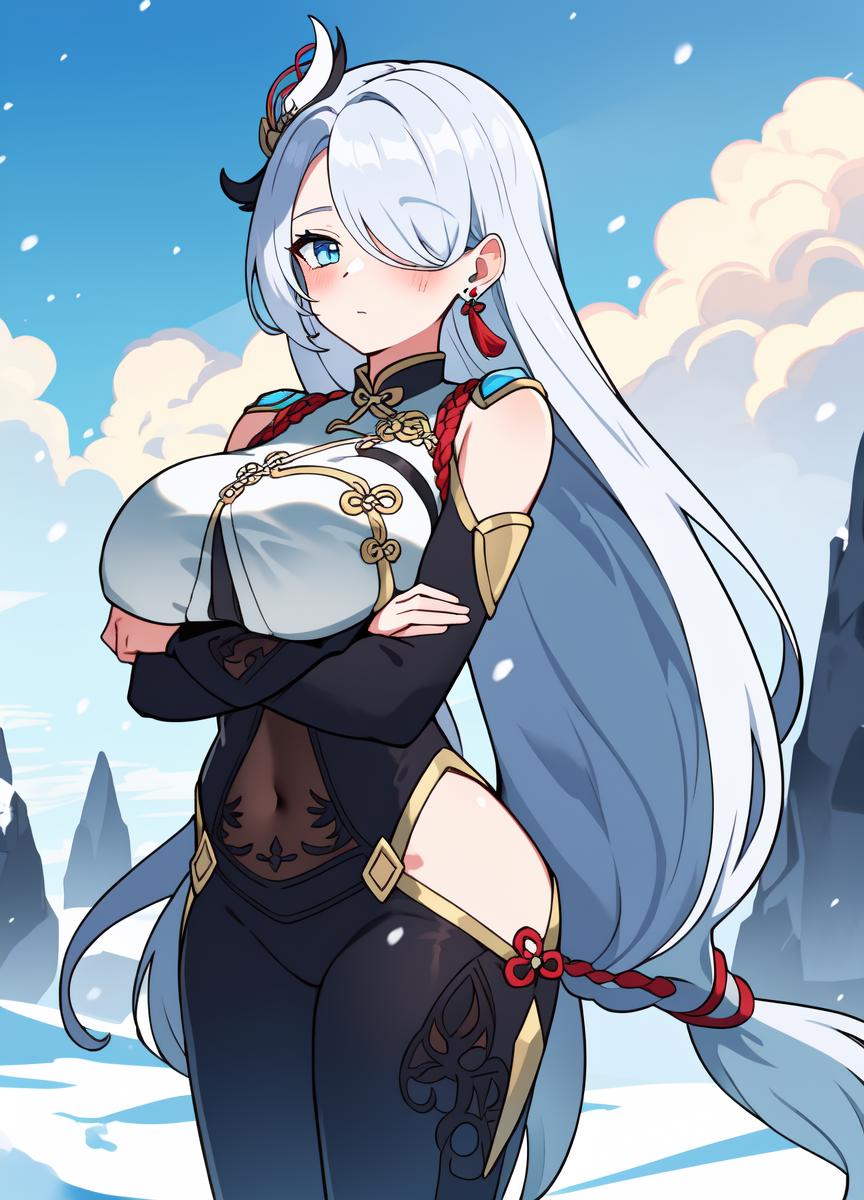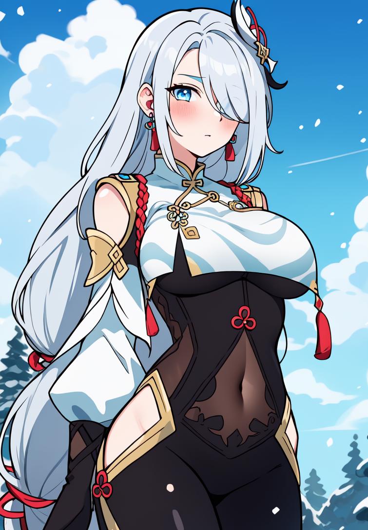 • Recommended positive prompts: shenhe_genshin, 1girl, (((solo))), ((grey hair)), (((light blue eyes))), long hair, (very long hair), ((hair over one eye)), ((braided ponytail)), chinese clothes, ((white breasts)), bodysuit, ((white bodysuit)), ((white chest)), ((((breast courtain)))), ((((breast large courtain)))), long sleeves, shoulder cutout, covered navel, clothing cutout, black gloves, partially fingerless gloves, ((hip vent)), earrings, jewelry, tassel, serious, hair ornament
