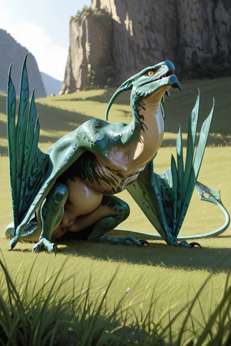 green body, light underbelly, no humans, yellow eyes, solo, dragon, winged arms, winged legs, tail, claws, long red bump on chin