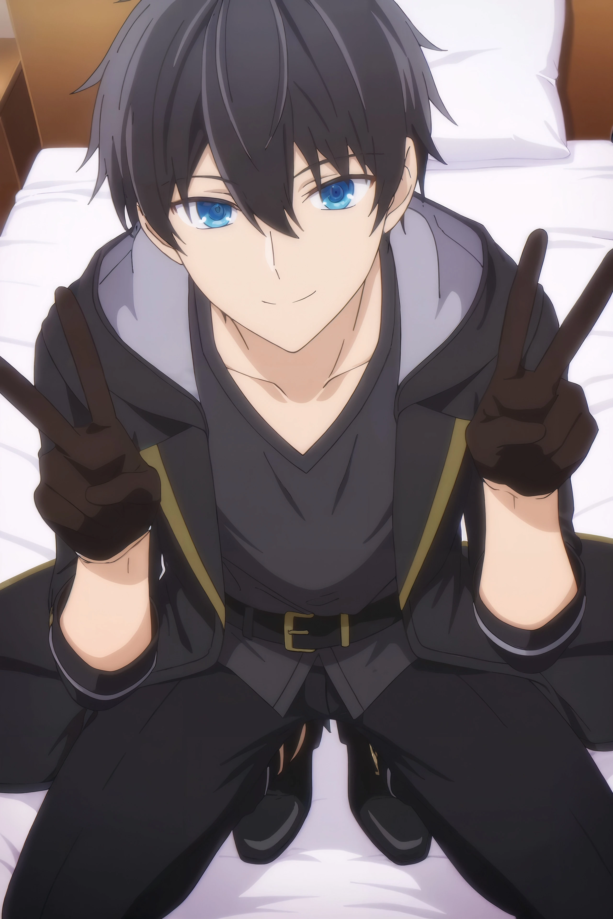 Orun Dura, black hair, blue eyes, black long coat with gold trim, dark gray v-neck inner shirt, black pants, black belt with gold buckle, black gloves, black shoes with gold trimLogan Hayward: