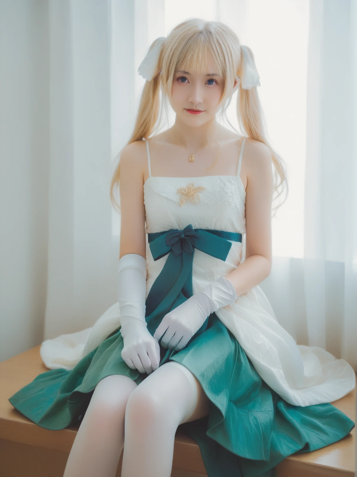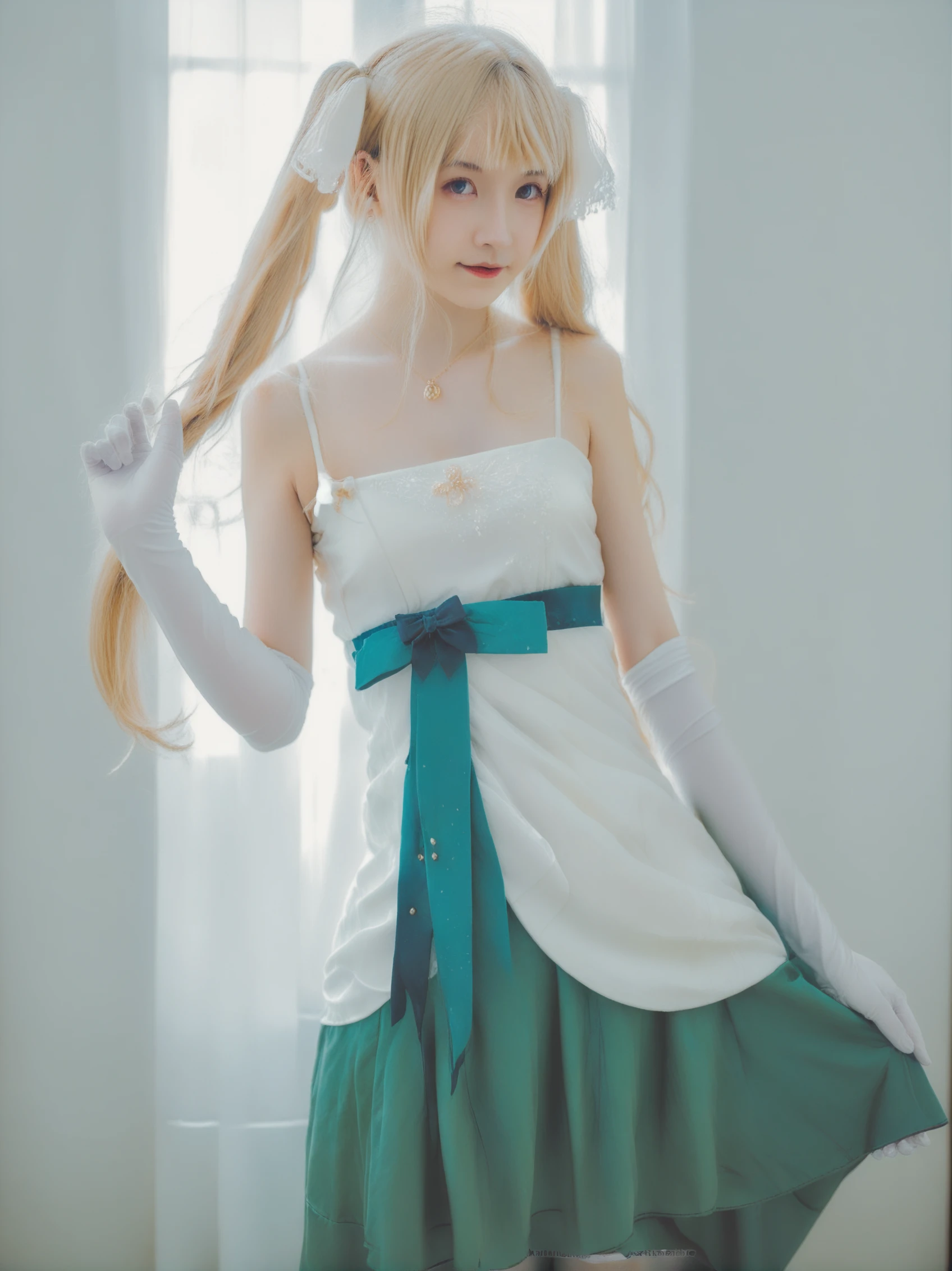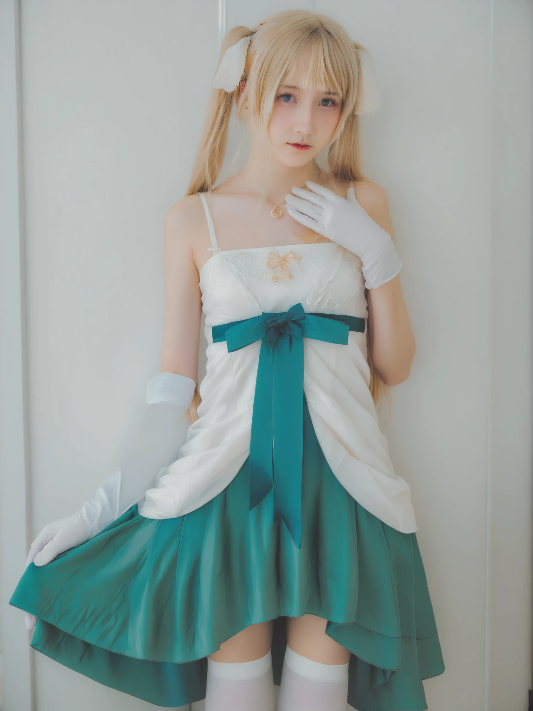 я не нашел информации о том, какой это персонаж. скорее всего косплей оригинального стиля. получатся должно примерно как на моих картинках.теги\tags - Blonde, Dress, Gloves, Twintails, yui-goldfish, White stockings, White dress, green skirt