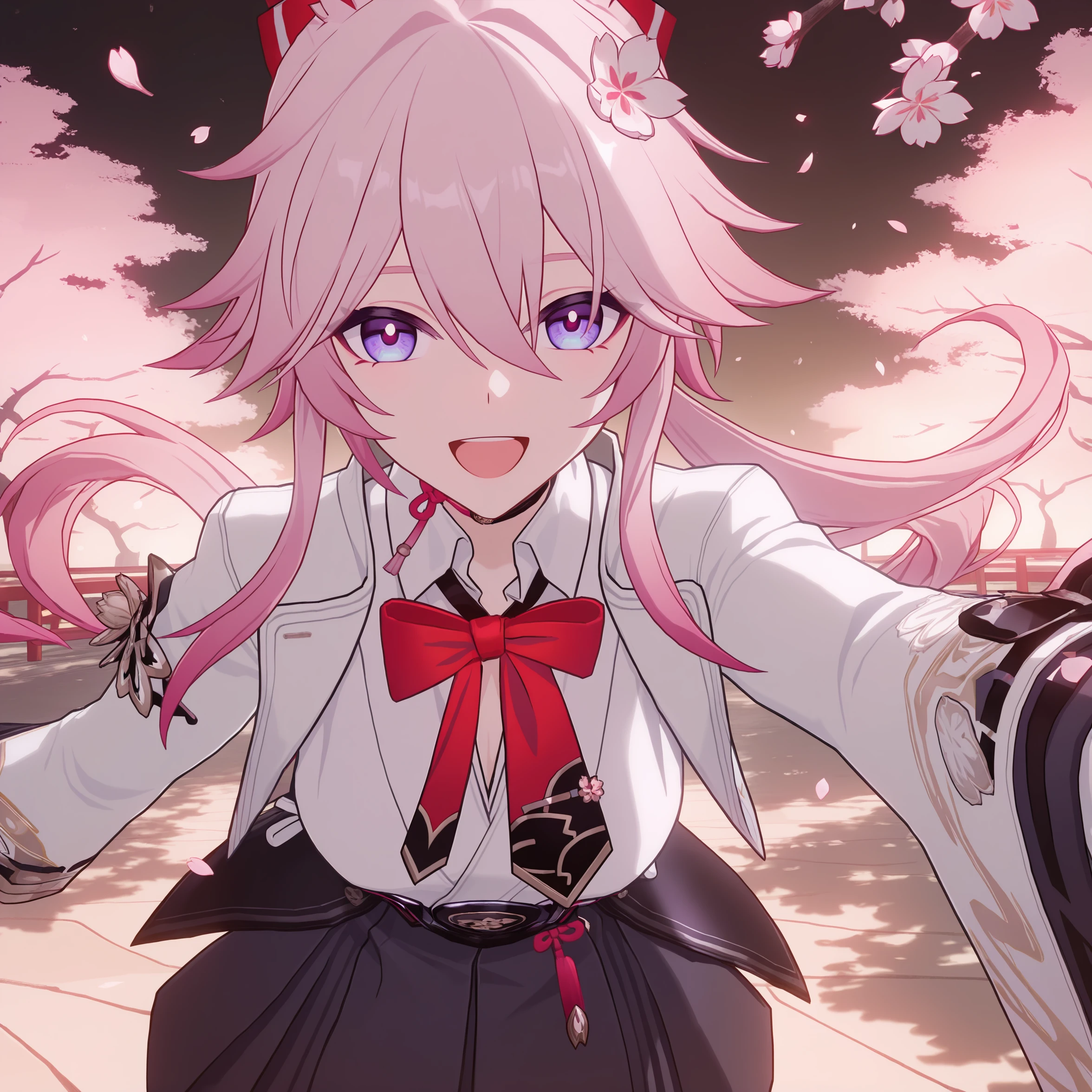 masterpiece, best quality, very aesthetic, newest, hires, Evanescia, 1girl, solo, looking at viewer, smile, white jacket, white shirt, bow, upper body, detailed light, simple background,全身prompt: