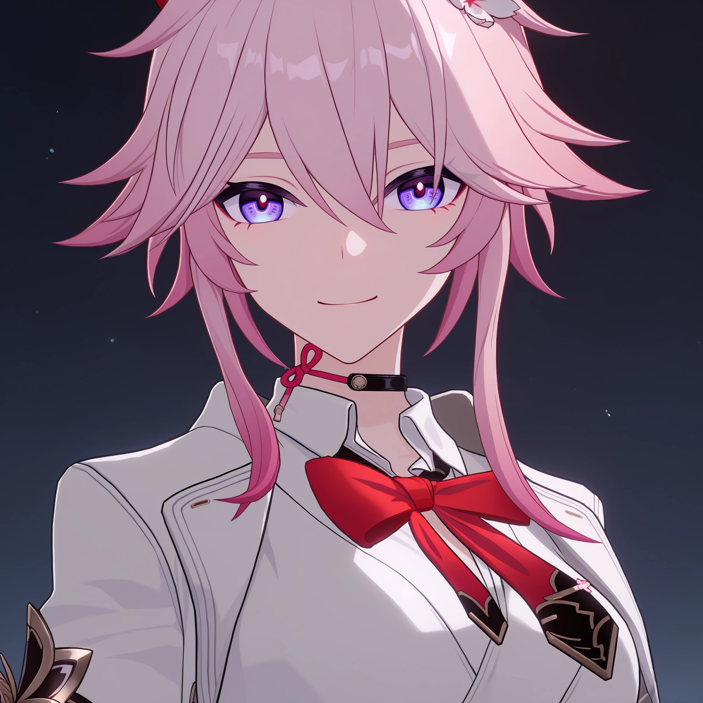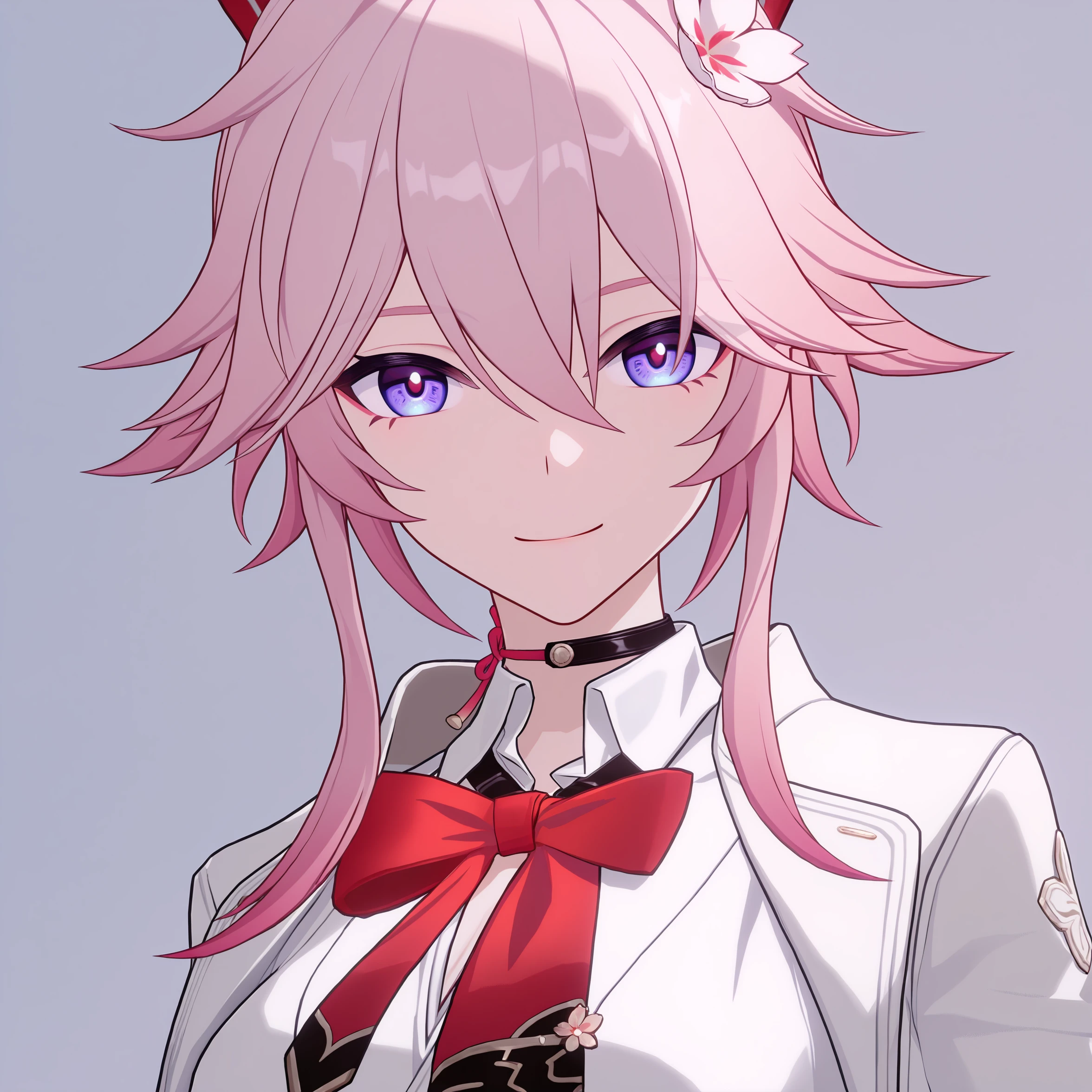 masterpiece, best quality, very aesthetic, newest, hires, Evanescia, 1girl, solo, looking at viewer, smile, white jacket, white shirt, bow, upper body, detailed light, simple background,full body: