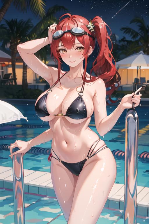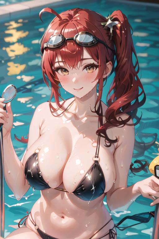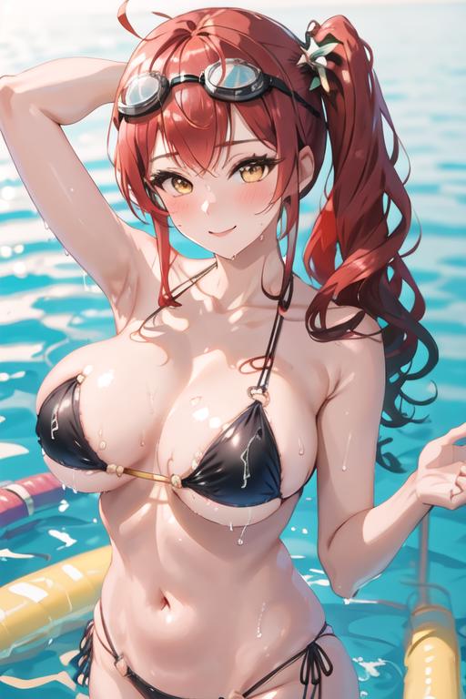 red_hair, long_hair, breasts, bangs, blush, side_ponytail, large_breasts, swimsuit, bikini, cleavage, black_bikini, collarbone, smile, wet, goggles, yellow_eyes, goggles_on_head, o-ring, o-ring_bikini, hair_ornament, ahoge