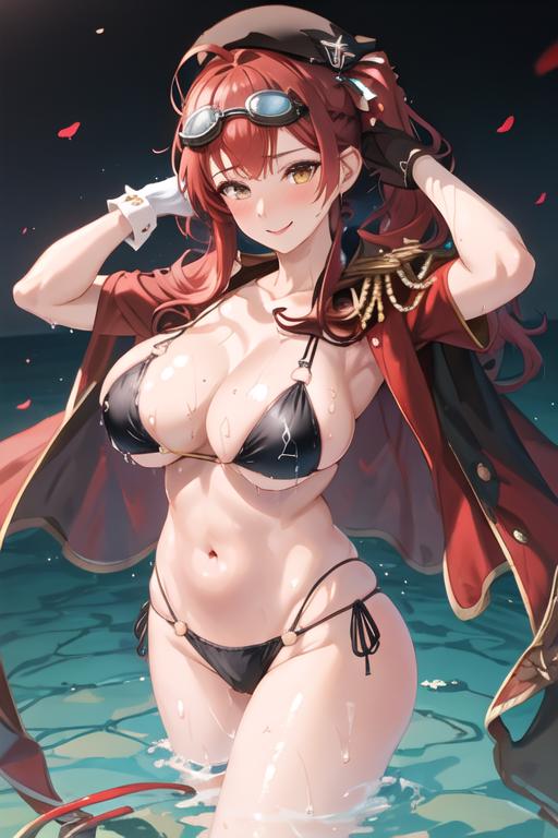 The trigger word is zara_azurlane, and the recommended tags are best quality, masterpiece, highres, solo, {zara_azurlane:1.15}, red_hair, long_hair, breasts, bangs, blush, side_ponytail, large_breasts, swimsuit, cleavage, black_bikini, collarbone, smile, wet, goggles, yellow_eyes, goggles_on_head, o-ring, o-ring_bikini, hair_ornament, ahoge.