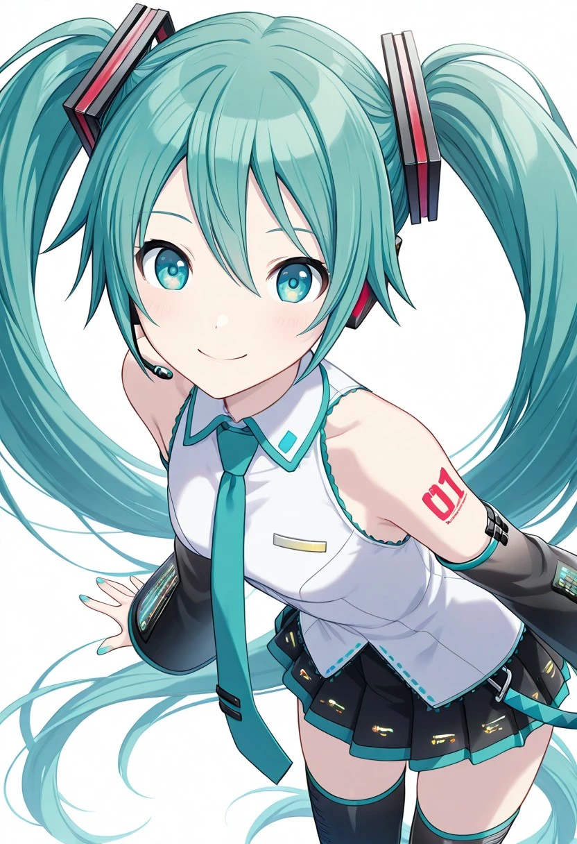 Miku Hatsune, solo, shirt, bare shoulders, black skirt, long hair, detached sleeves, twintails, hair ornament, skirt, necktie, very long hair, shoulder tattoo, white shirt, headset, sleeveless, pleated skirt, aqua hair, aqua eyes, sleeveless shirt, black sleeves, aqua necktie, mini skirt, black thighhighs, zettai ryouiki, aqua nails