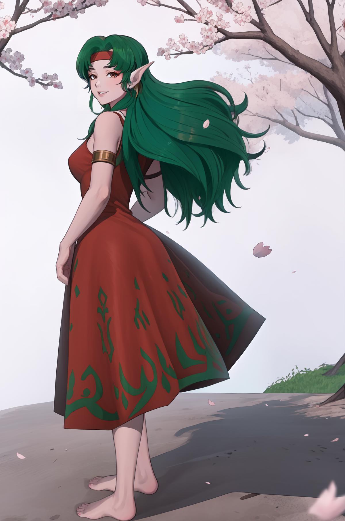 Tags: freyasmt, long hair, green hair, pointy ears, red dress, jewelry, barefoot, headband, armlet