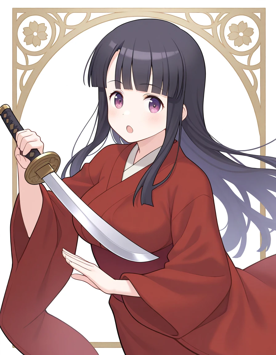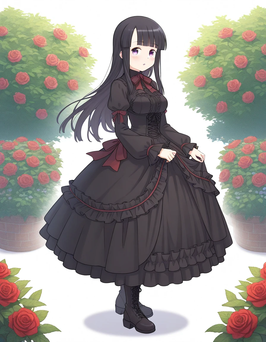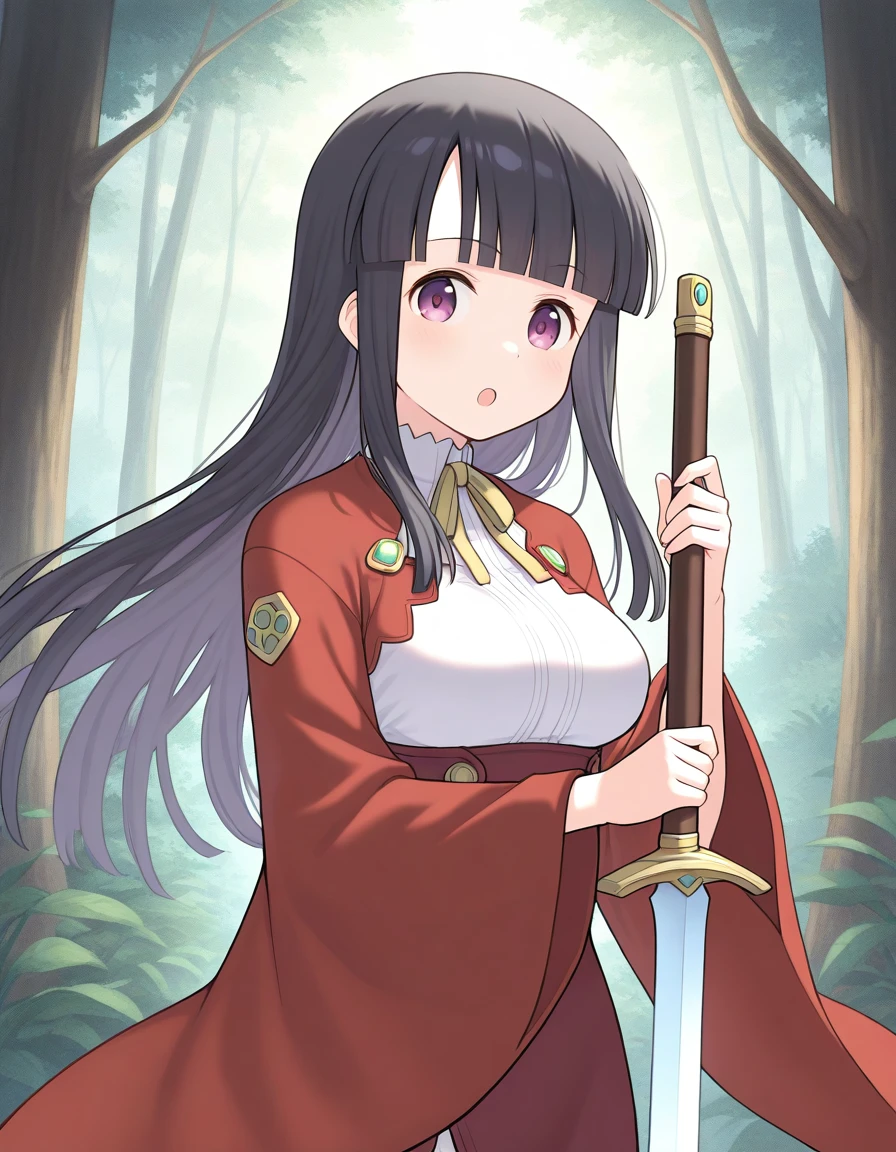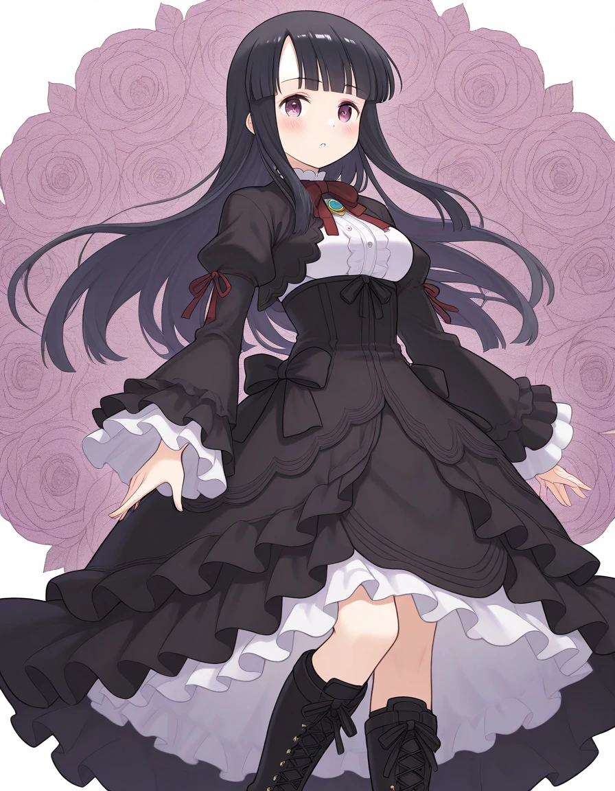 HiguchiAya, 1girl,solo, long hair, black hair, blunt bangs, black eyes, medium breasts,
