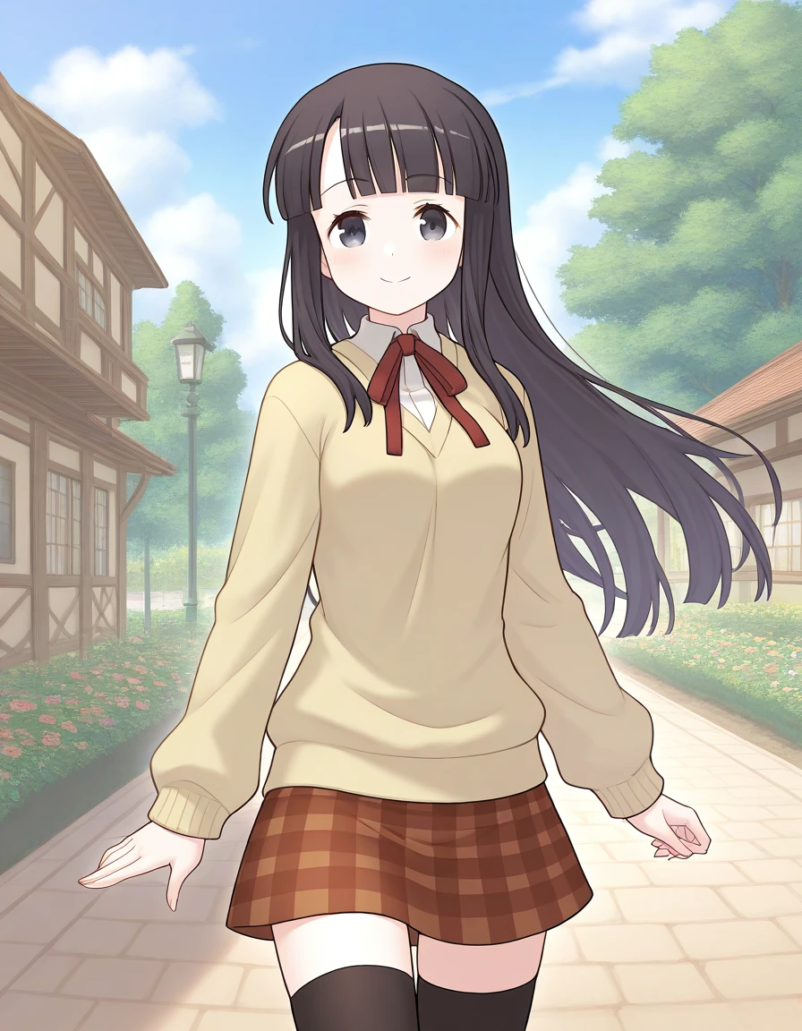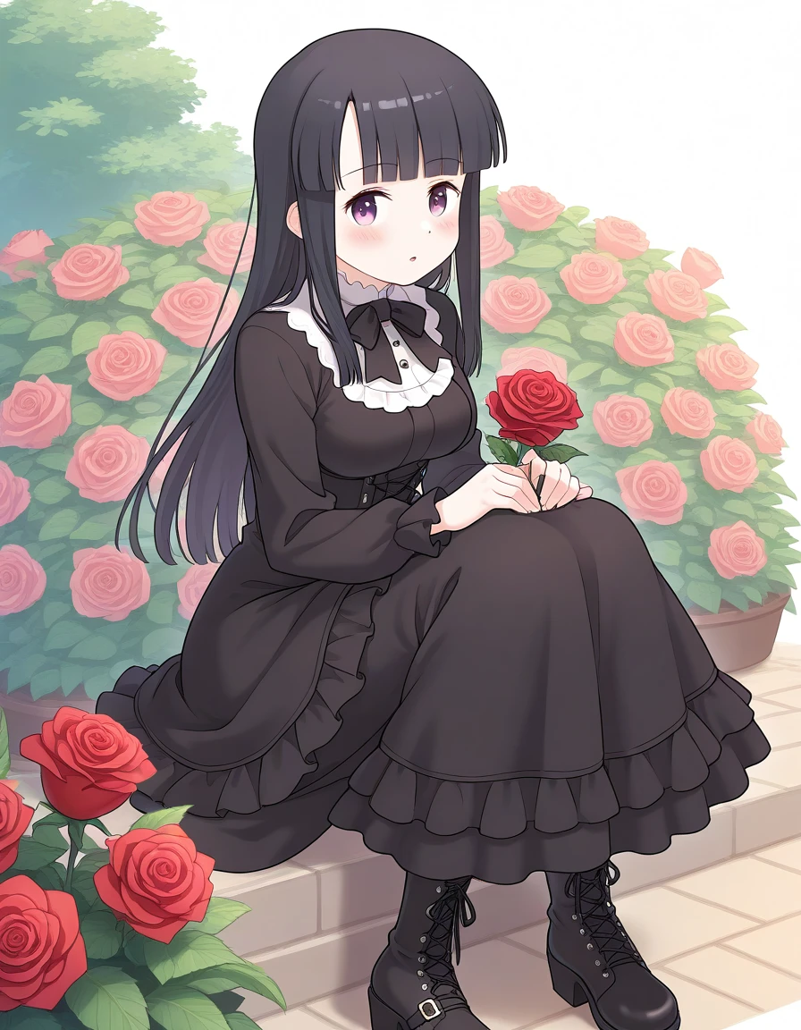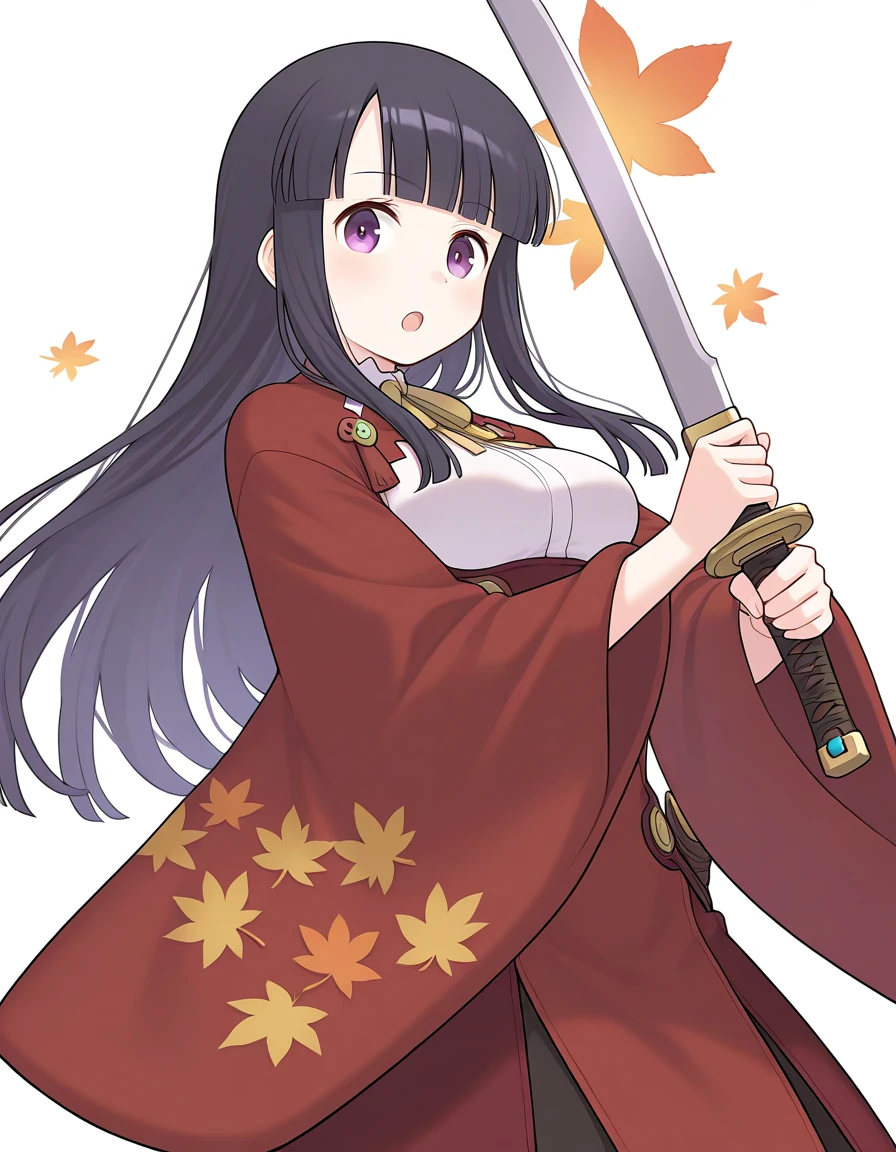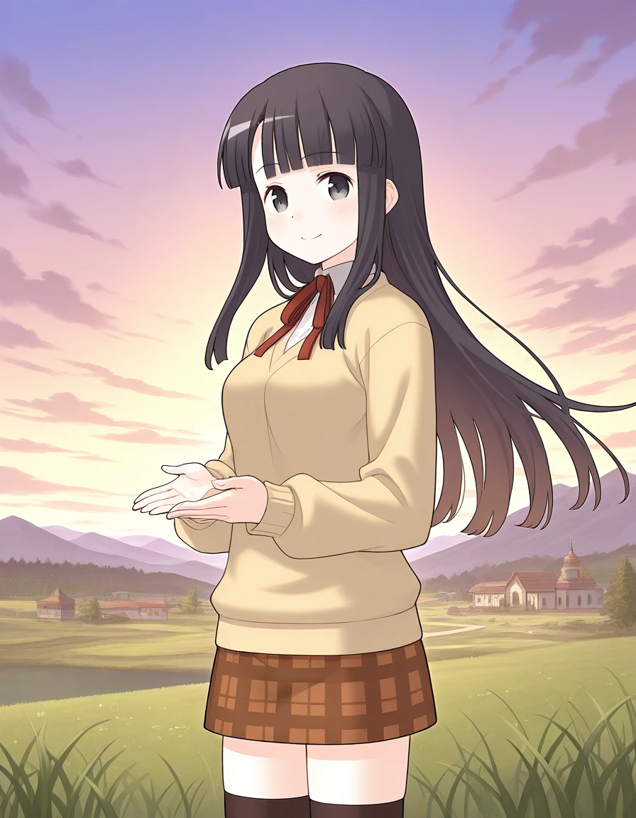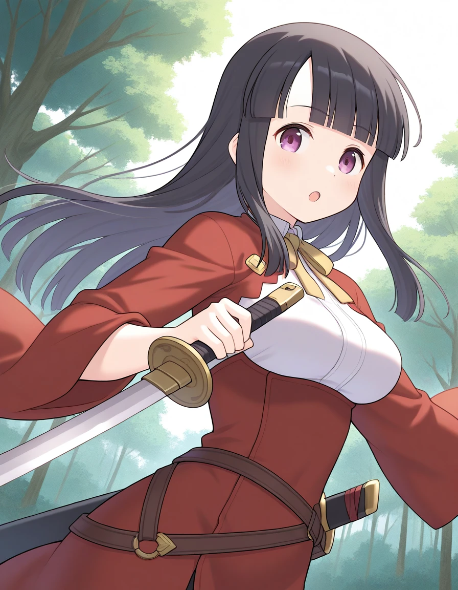 HiguchiAya, 1girl,solo, long hair, black hair, blunt bangs, black eyes, medium breasts,