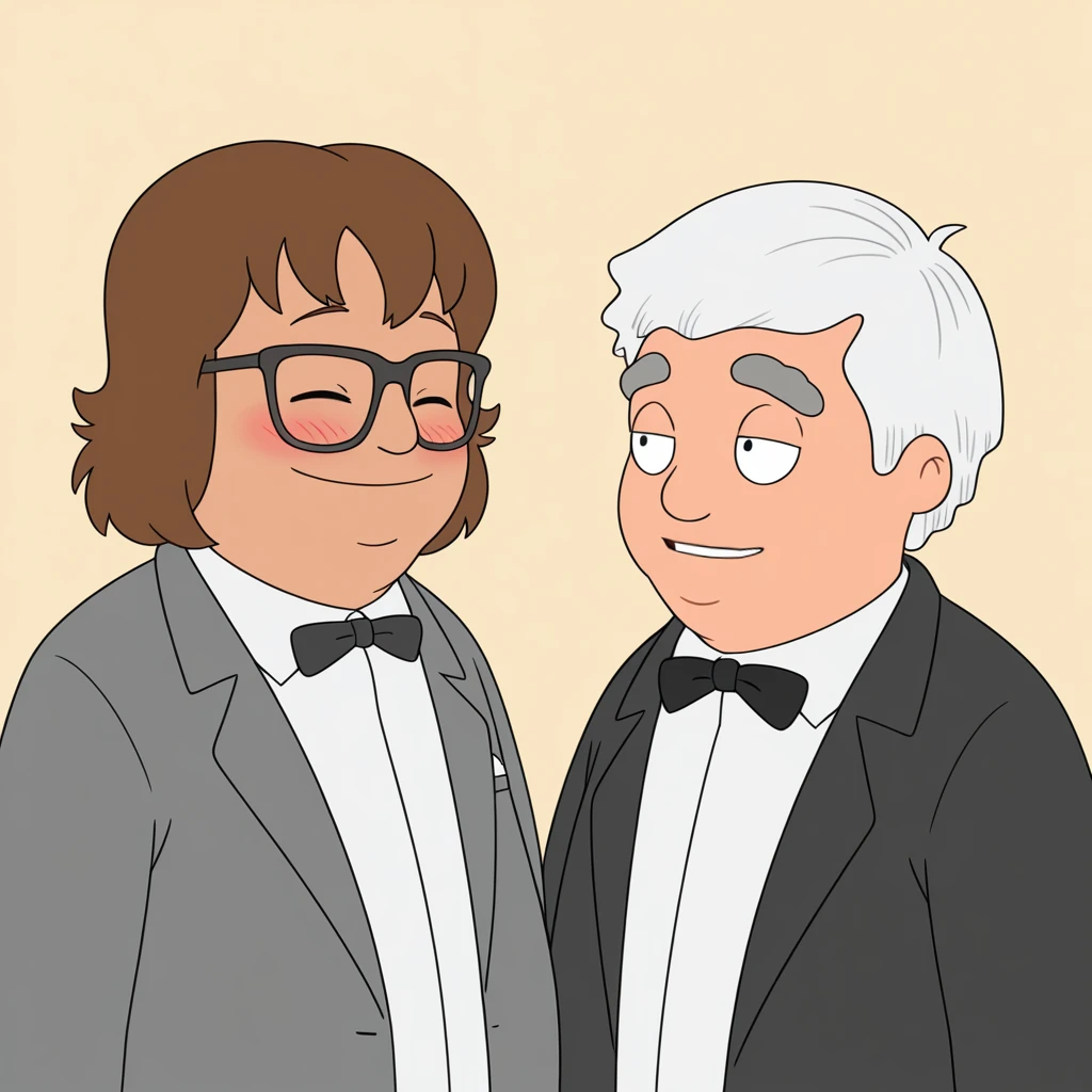 ((bb-alex), brown hair, chubby), 2boys, male focus, glasses, "individual clothing, individual action"