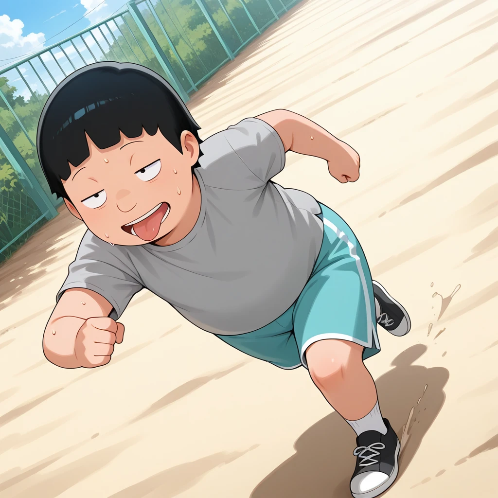 • gym_uniform, grey t-shirt, aqua shorts, black sneakers,