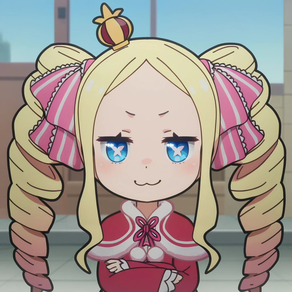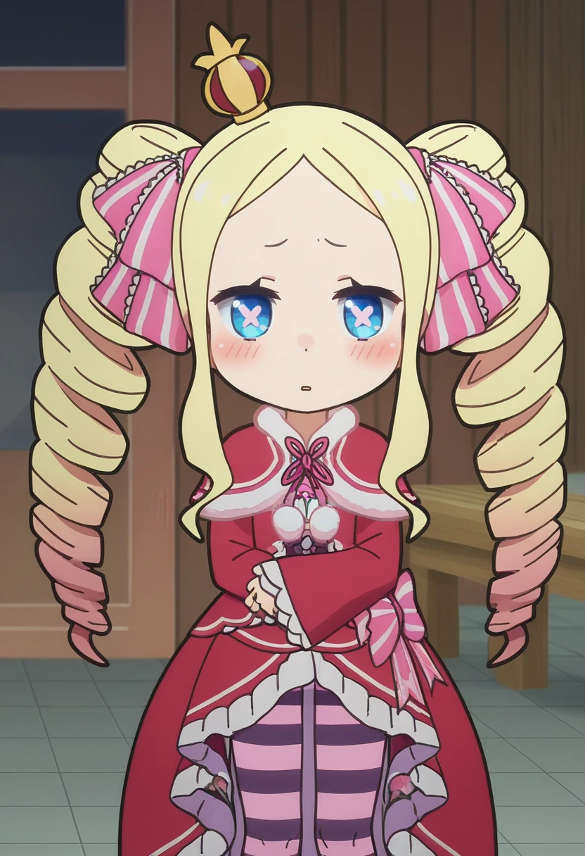 beako, symbol-shaped pupils, blonde hair, crown, drill hair, mini crown, twin drills, blue eyes, hair ribbon, chibi, sidelocks, red dress, striped pantyhose, pink shoes,