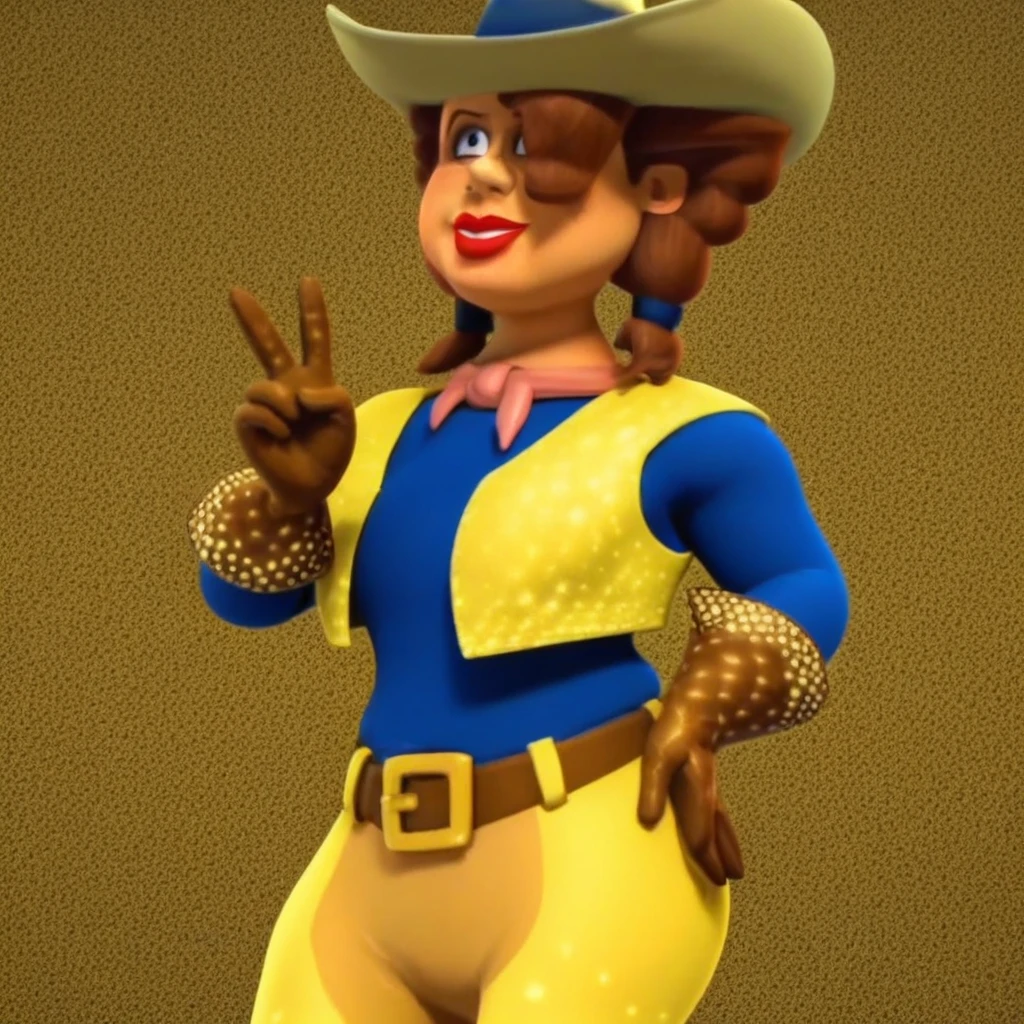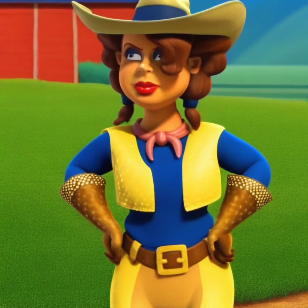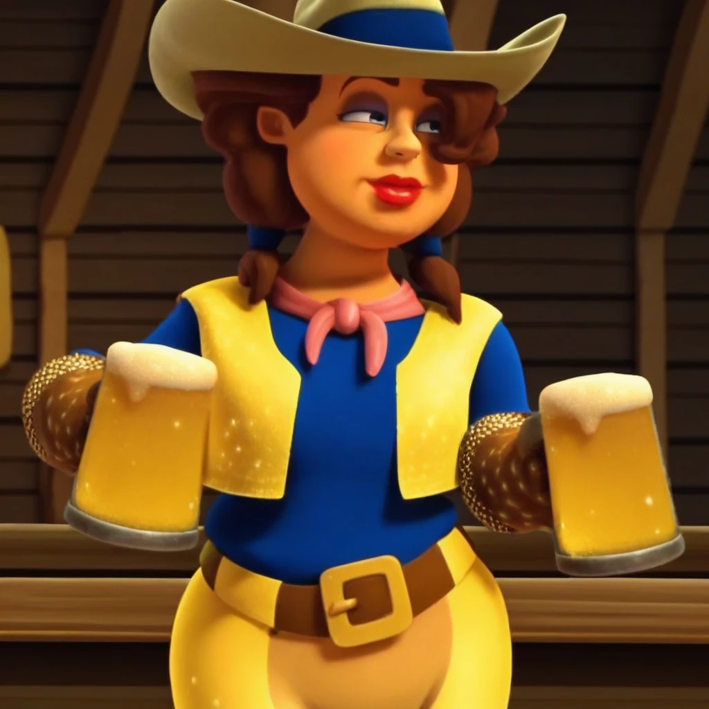 bronco_betsy, brown hair, cowboy hat, vest, gloves, belt