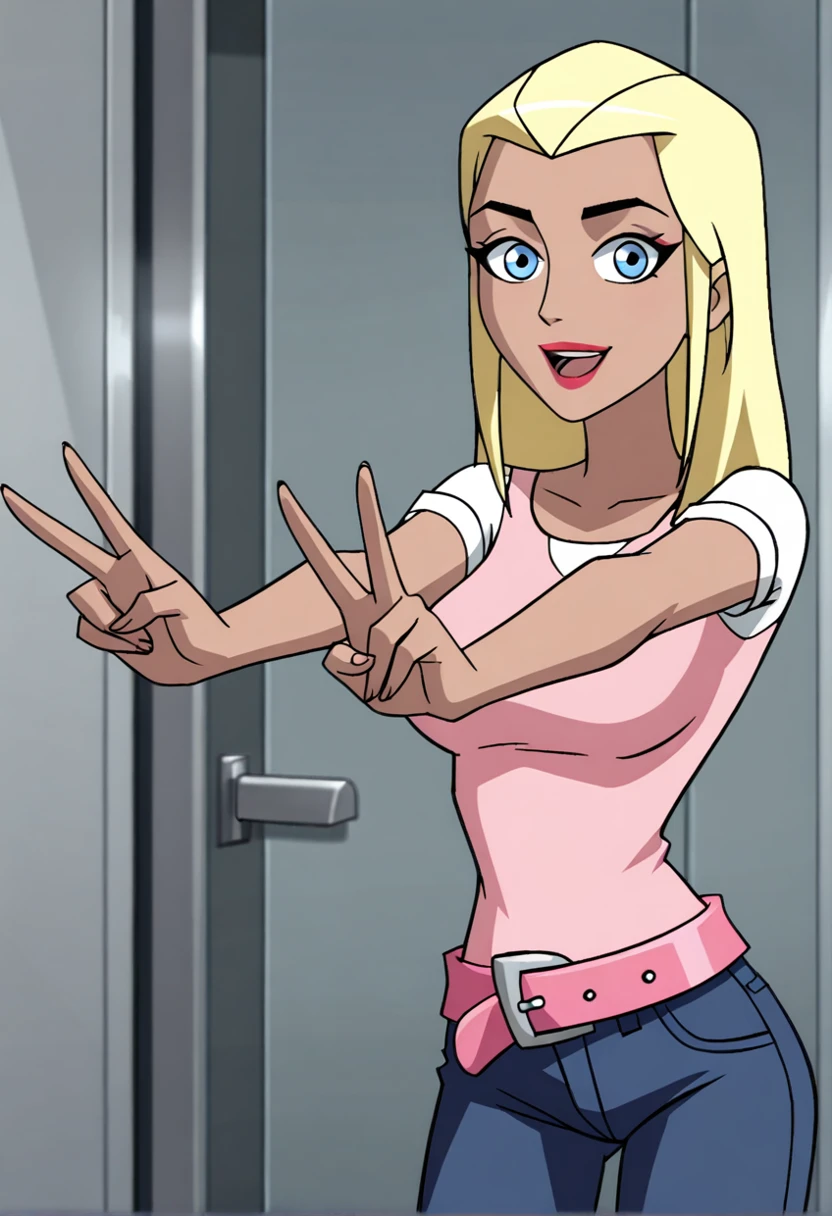 Trigger = hq2004, Tags = 1girl, solo, blonde hair, long hair, blue eyes, lipstick, white shirt, pink tank top, jeans, belt, breasts
