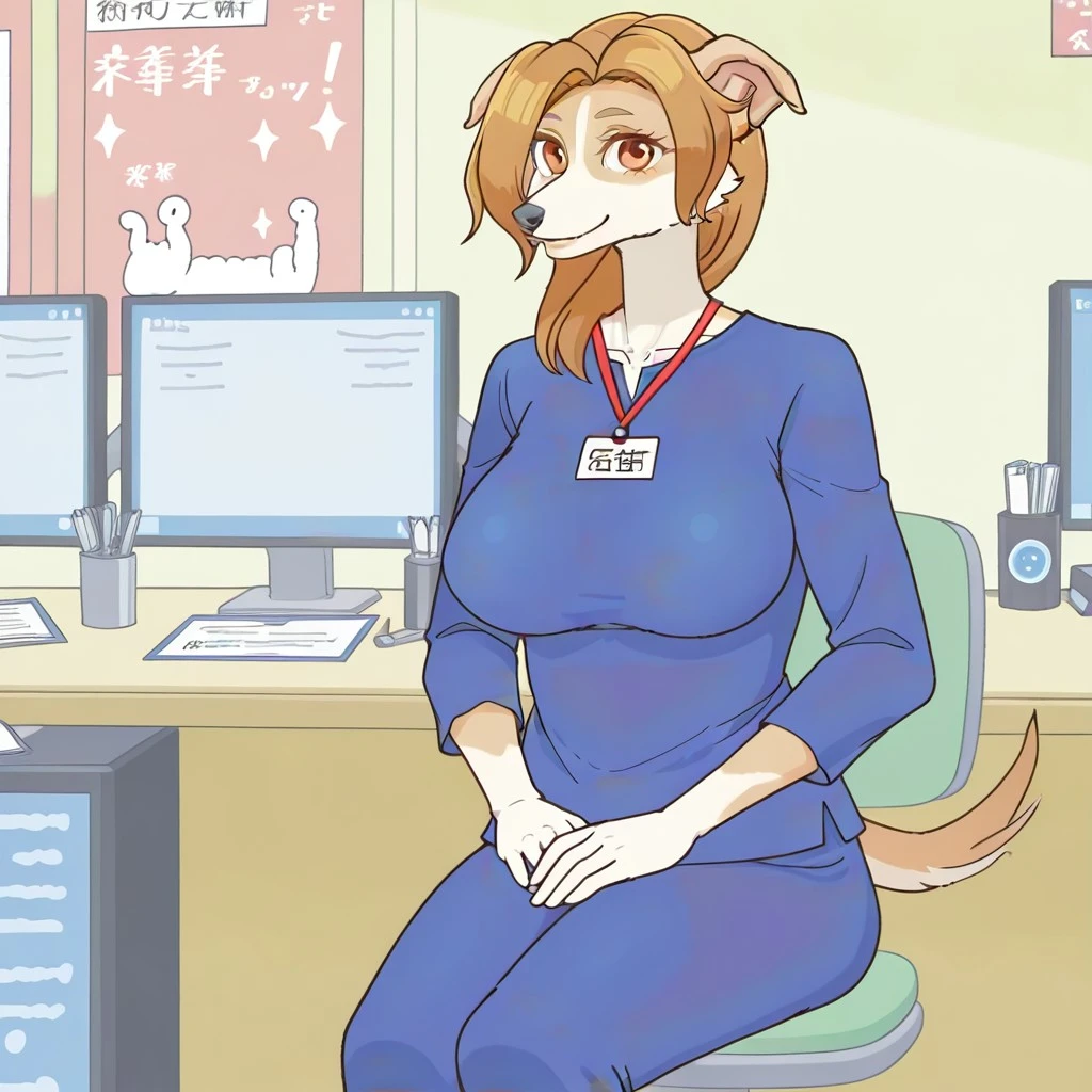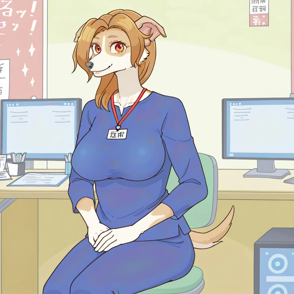 dog, dog girl, greyhound, brown and white fur, light brown hair, medium hair, amber eyes, black nose, dog ears, dog tail, , doctor outfit, blue shirt, blue pants, red lanyard, ID card,