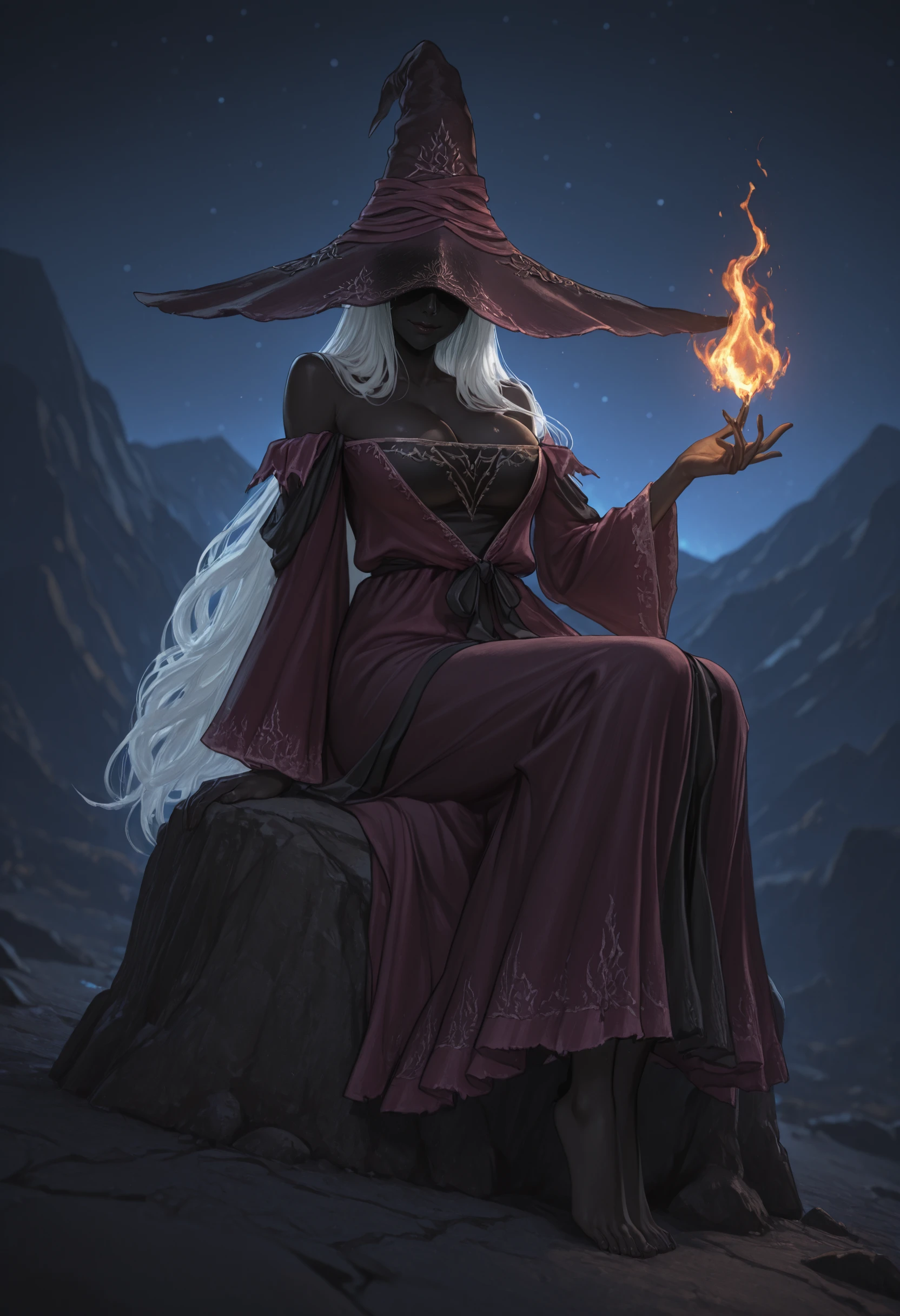 recluse \(elden ring\), black skin, lips, large breasts, very long hair, white hair, witch, witch hat, purple robe, cleavage, bare shoulders, barefoot, hat over eyes
