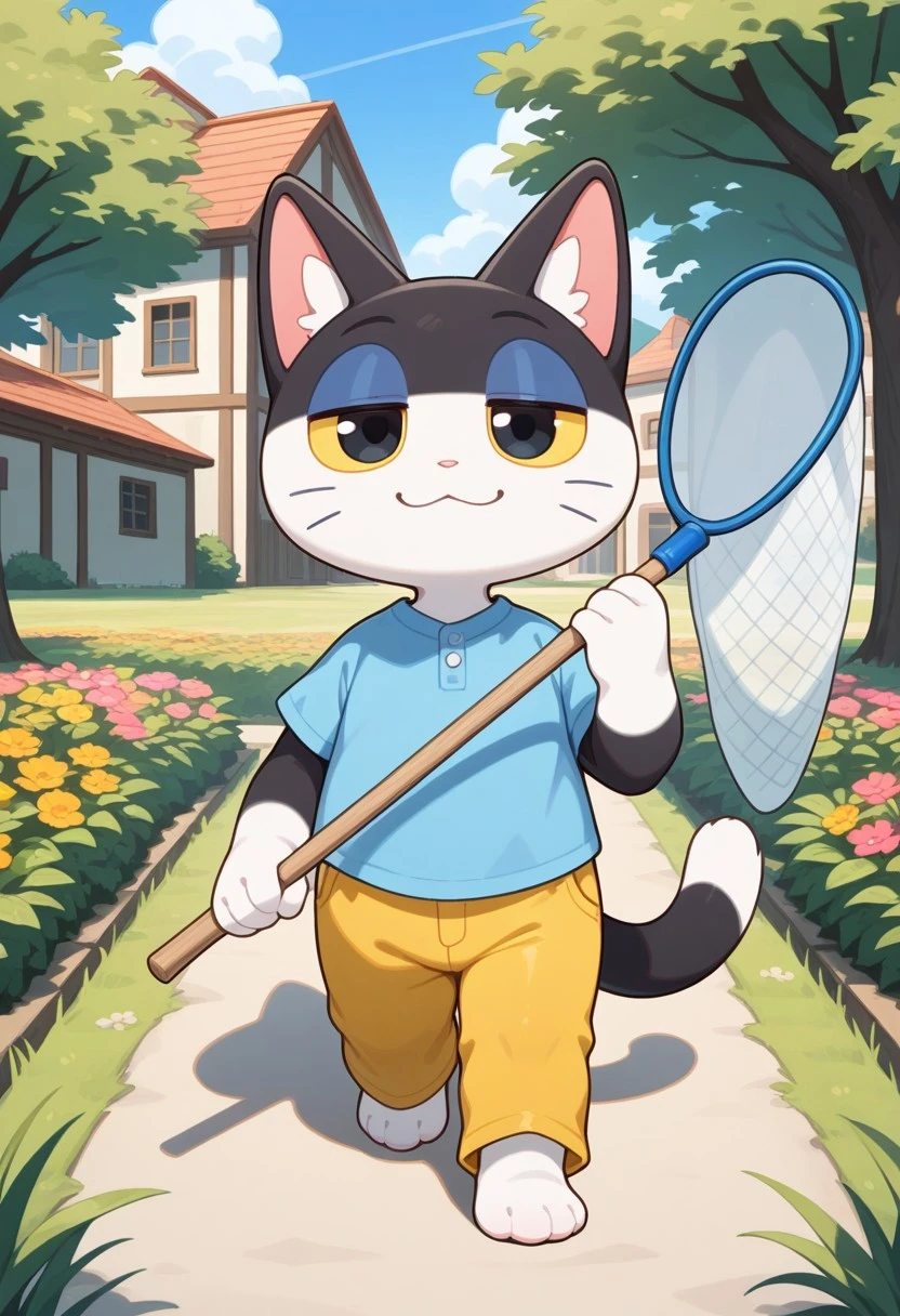 Tags: punchy_ac, anthro, furry male, black fur, white fur, two-tone fur, black eyes, colored sclera, yellow sclera, blue eyelids, cat tail, whiskers,