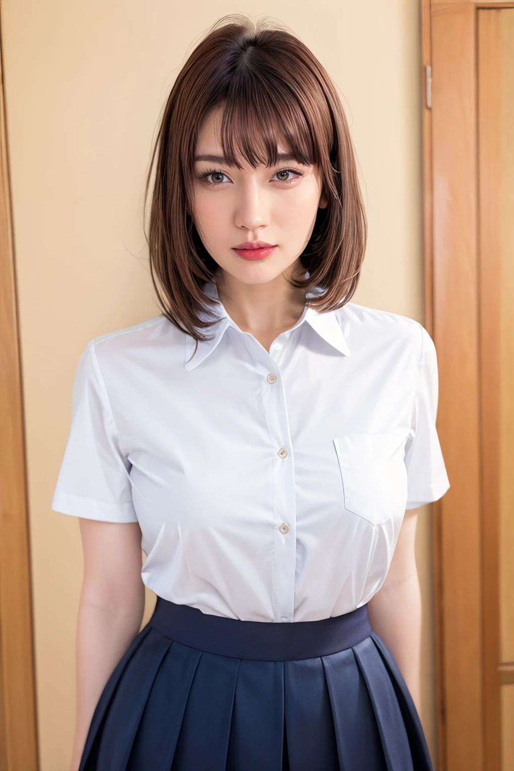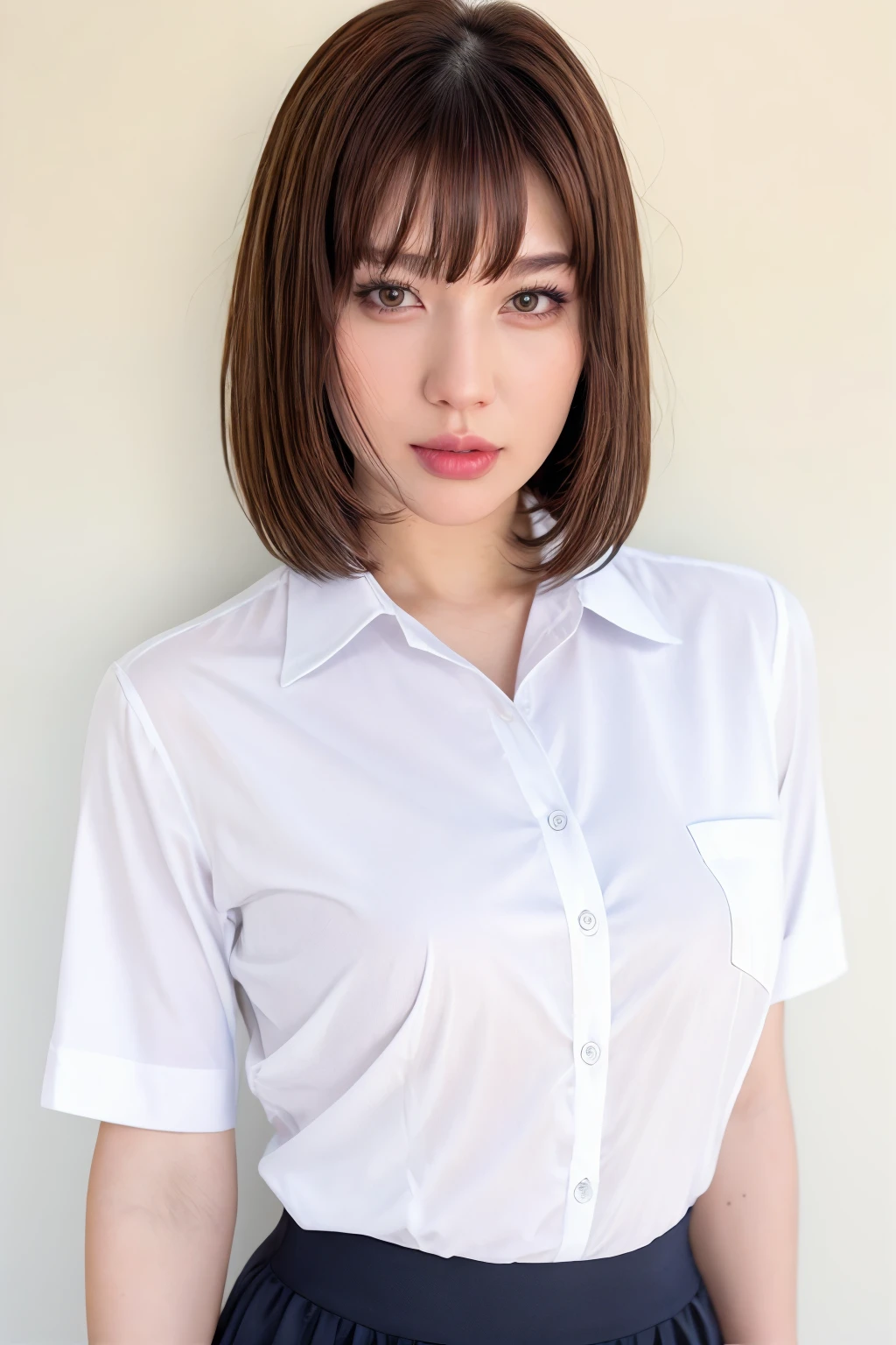 hondariko_jav, breasts, short hair, brown hair, brown eyes, bangs, makeup,