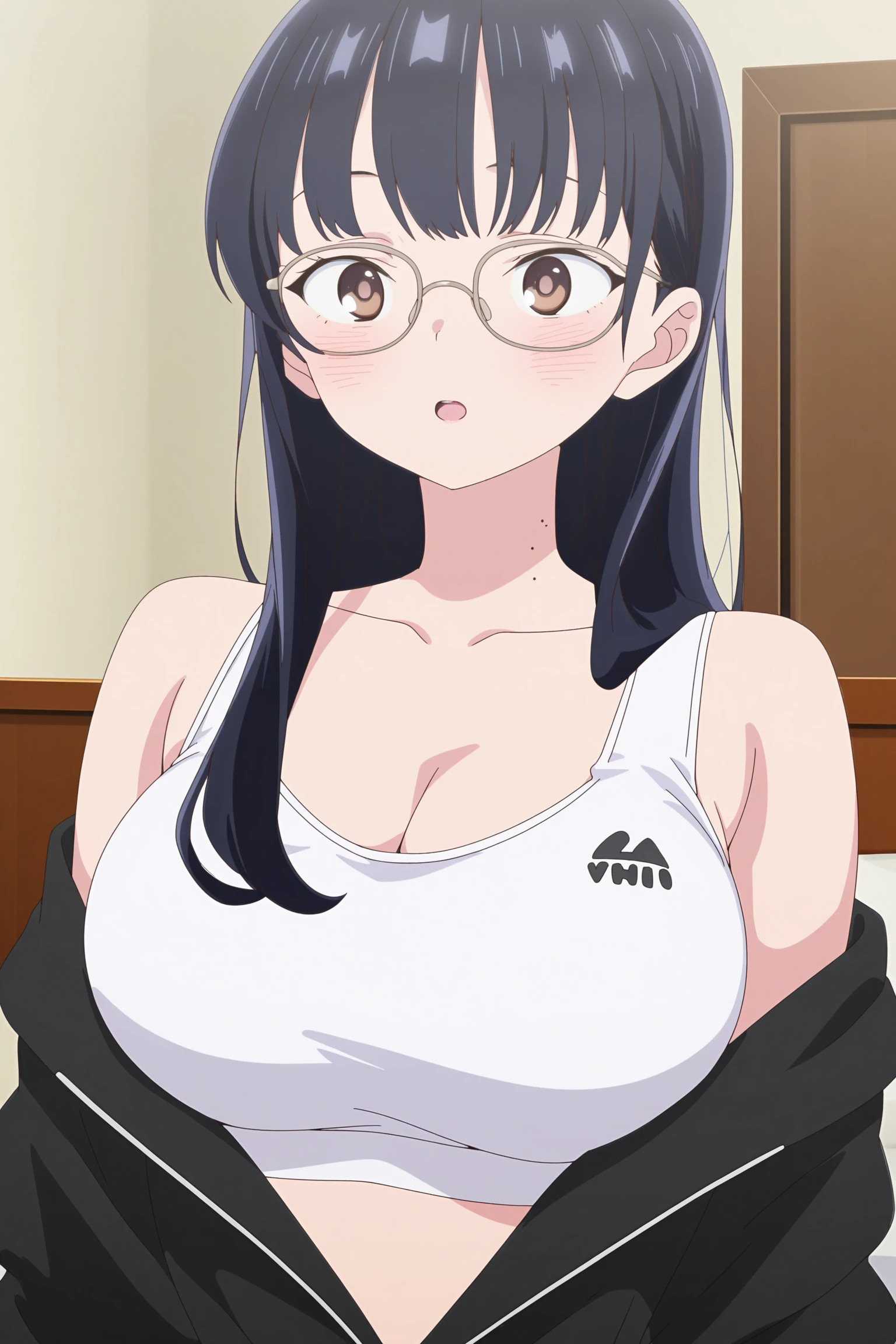 Keywords you’ll almost always want to use: long hair, black hair, brown eyes, mole on neck, bangs, large breasts, upper teeth only, | cleavage, earrings, red-framed eyewear, glasses, nail polish,