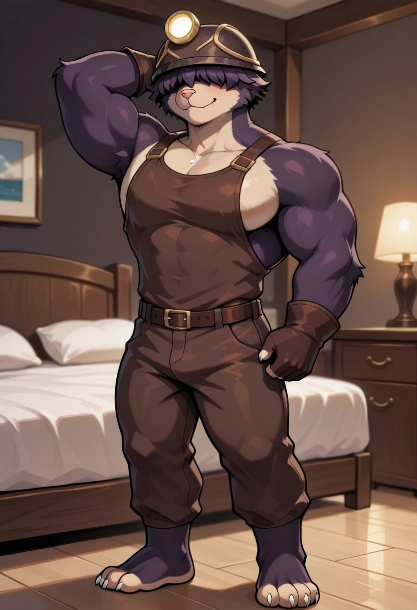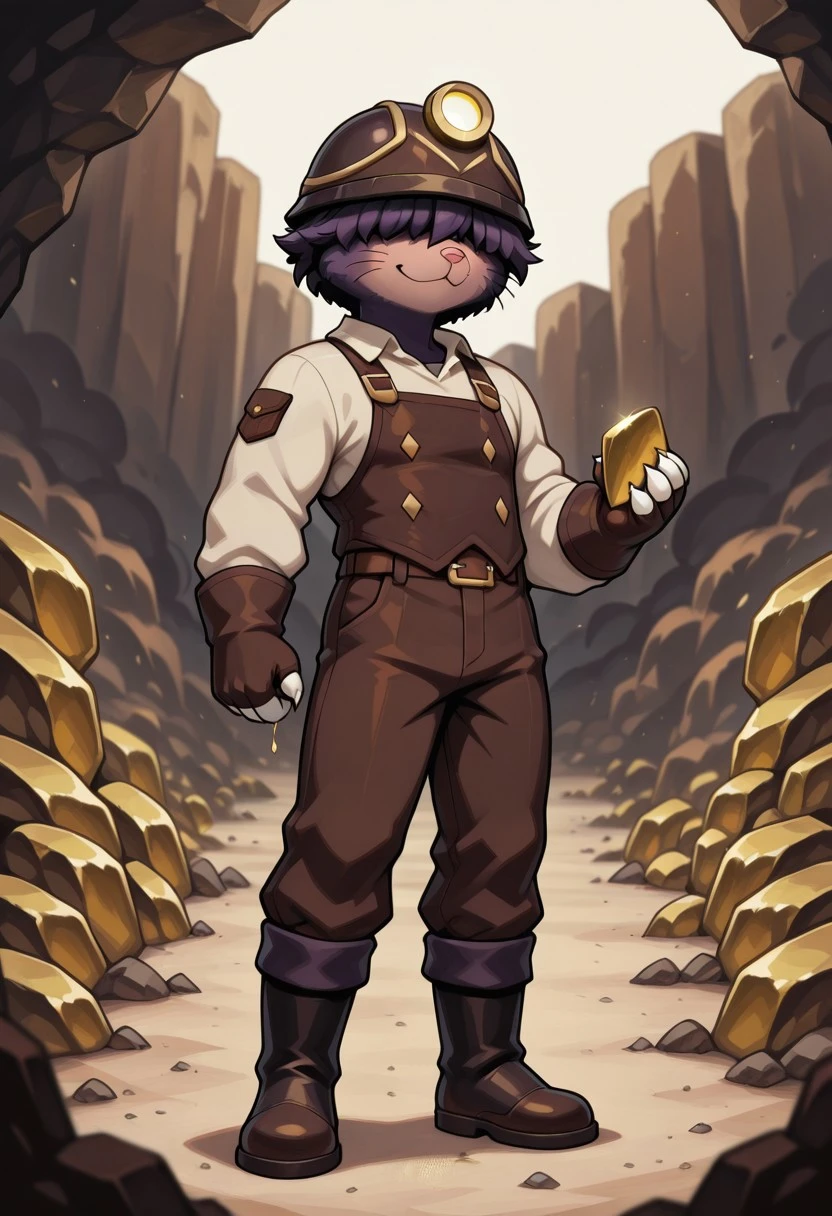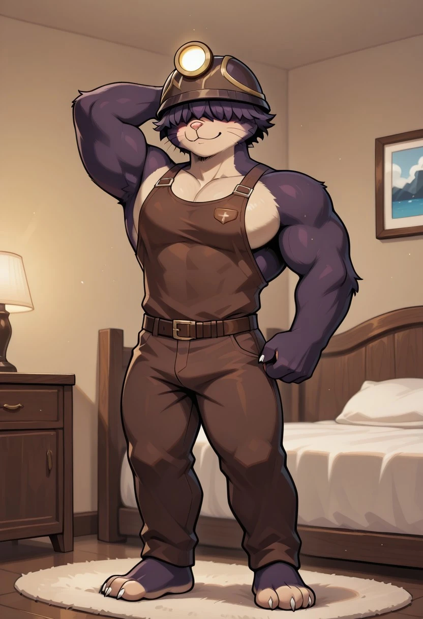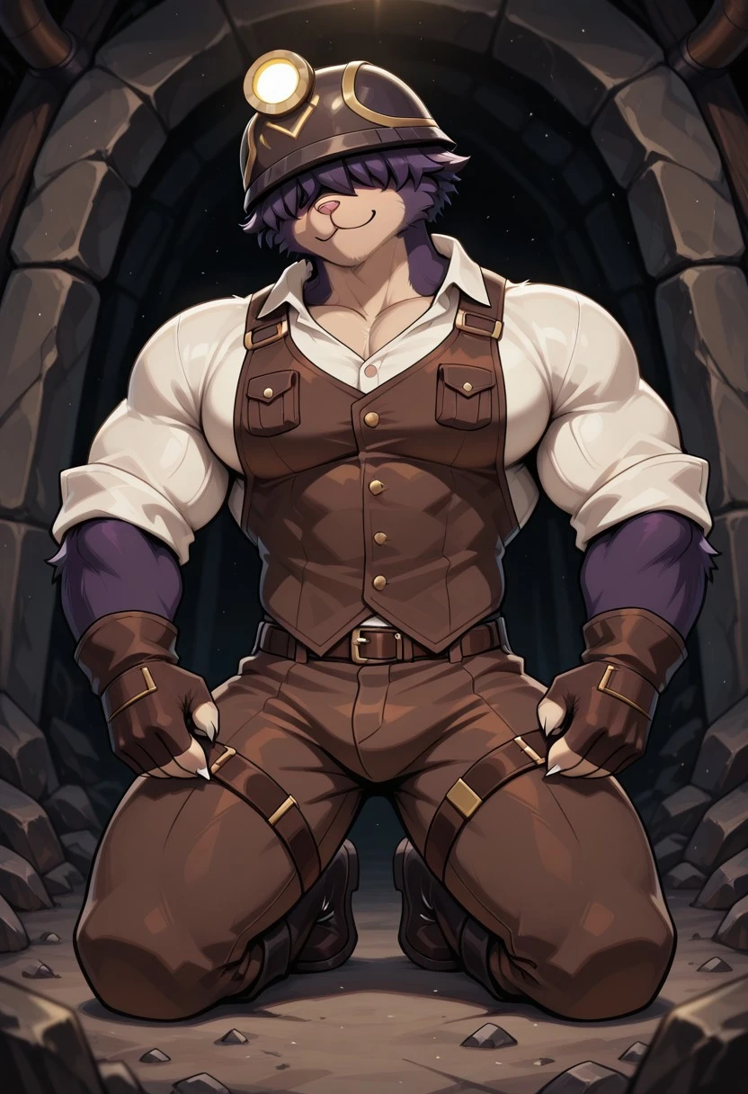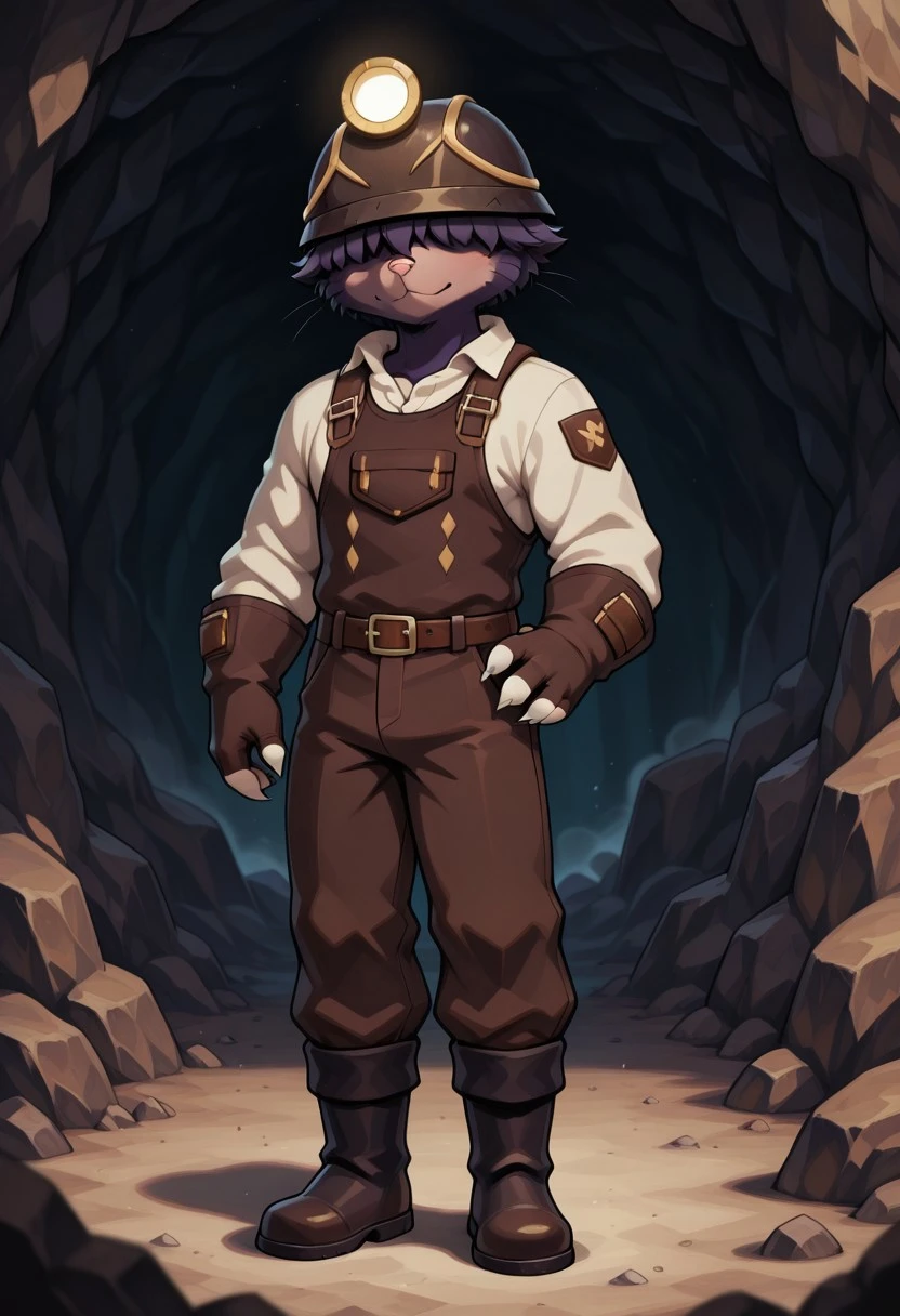 DougDF,anthro,mole, male, solo, dark purple fur,tan snout,pink nose, whiskers, no tail, fluffy hair covering eyes,miner helmet with glowing lamp, brown outfit with straps and patches, white claws, Brown Gloves,black boots