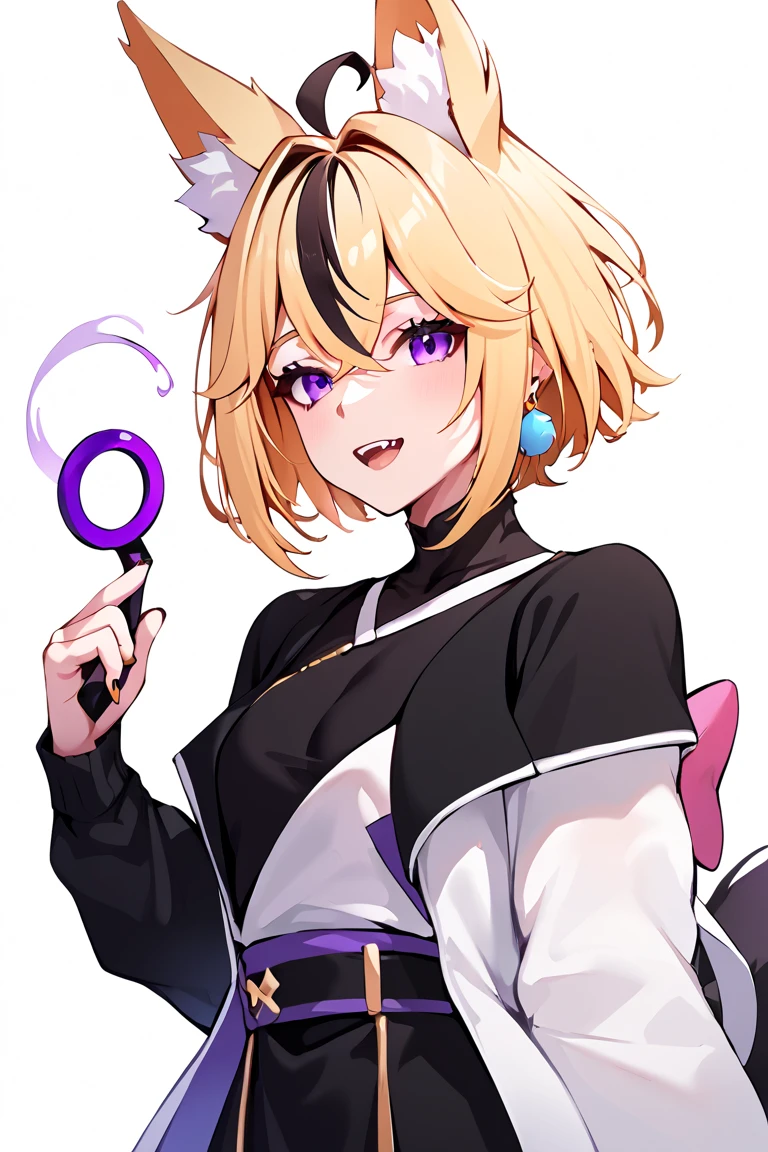 1girl,female focus,short hair,blonde hair,holding,animal ears,purple eyes,ahoge,multicolored hair,earrings,virtual youtuber,streaked hair,animal ear fluff,fox ears,fox tail,piercing,fox girl,ear piercing,black ahoge,