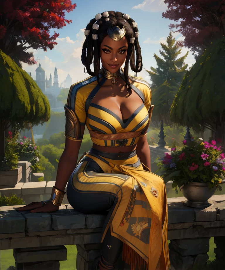 jewelry, yellow dress, or yellow bodysuit, hair ornament, - midriff, cleavage, pants or tight pants, pelvic curtain,
