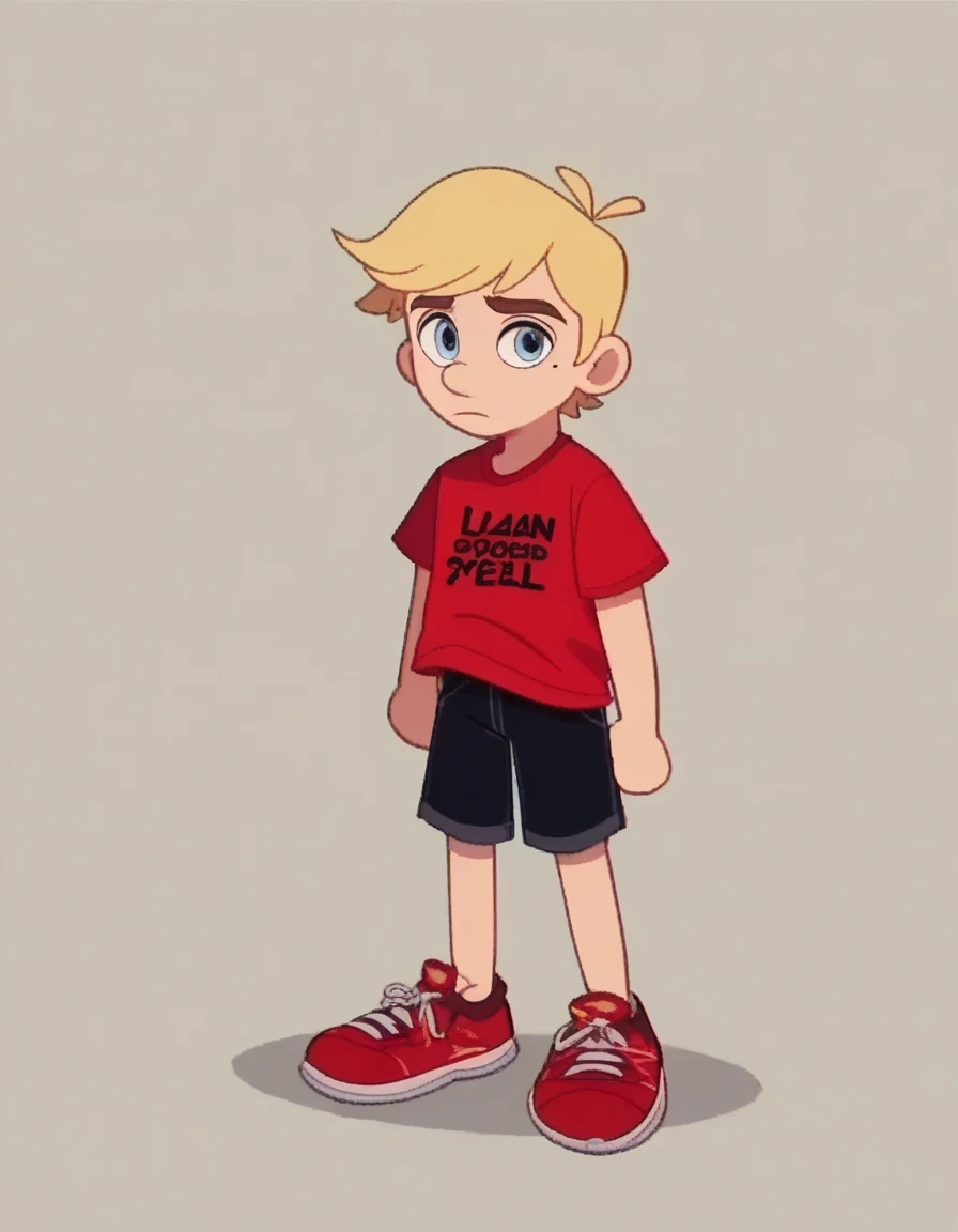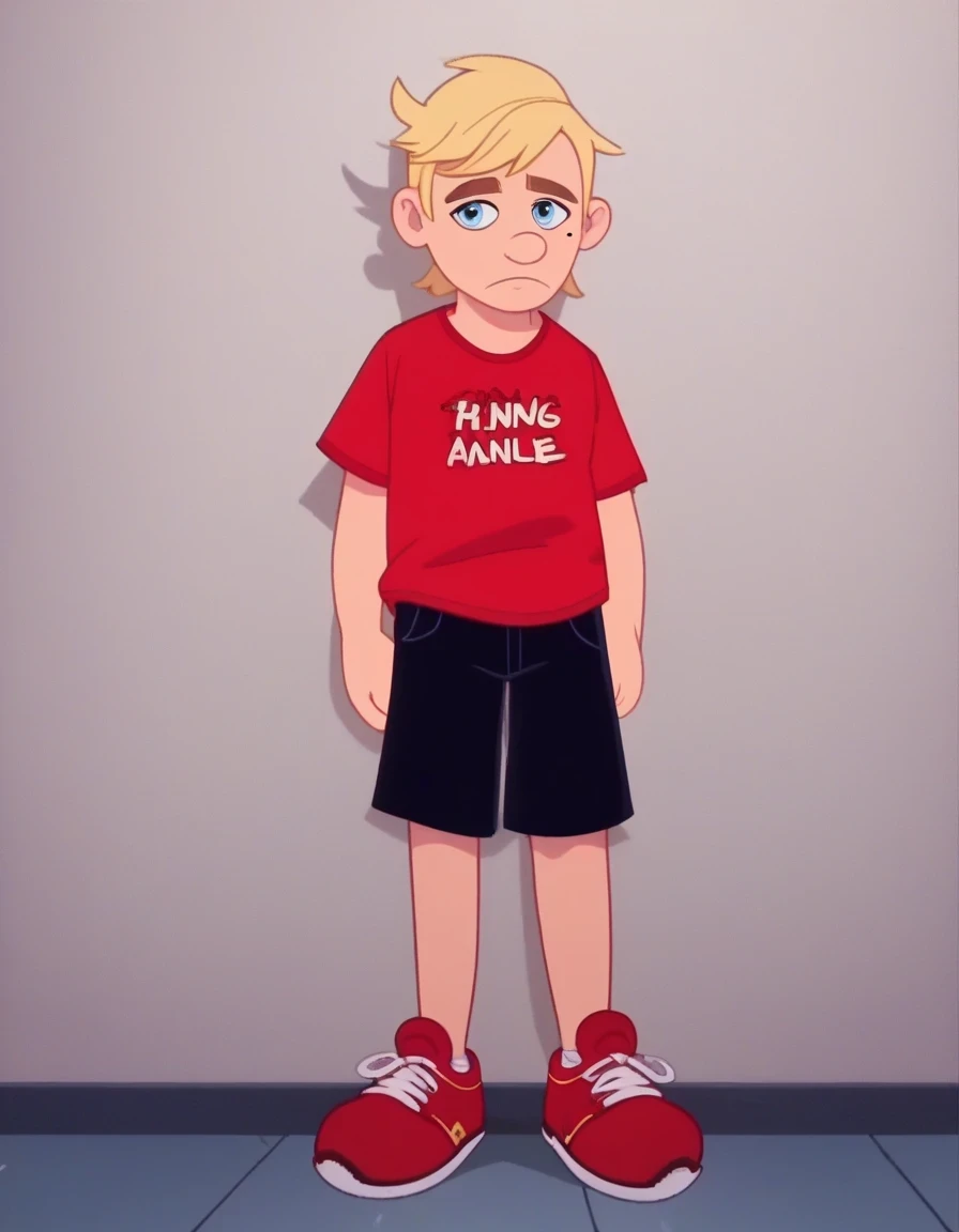 Logan_ThirtyacreSML, blue eyes, blonde hair, shirt, 1boy, shoes, shorts, mole, black shorts, t-shirt, red shirt, english text on red shirt, red shoes