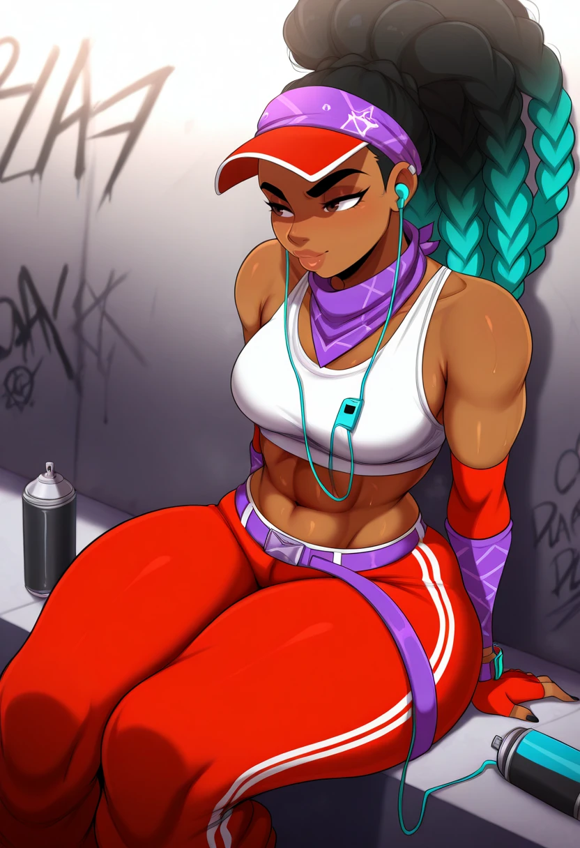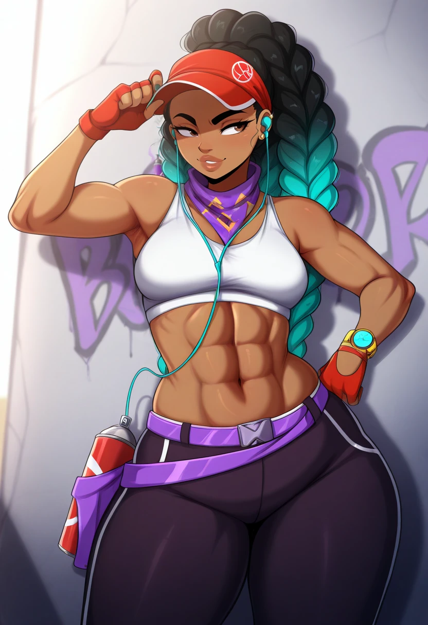 KimberlySF6IL,1girl,solo,long hair,black hair,gloves,navel,brown eyes,jacket,short sleeves,hairband,braids,multicolored hair,midriff,puffy sleeves,pants,dark skin,fingerless gloves,dark-skinned female,puffy short sleeves,lips,crop top,aqua hair,black pants,abs,red jacket,forehead,red gloves,cropped jacket,toned,watch,lowleg,wristwatch,cable,tight,hip vent,earphones,colored tips,yellow hairband,bow hairband,tight pants,capri pants,earbuds,linea alba,yoga pants,arm wrap,lowleg pants,leg wrap,spray can,yellow bow bel