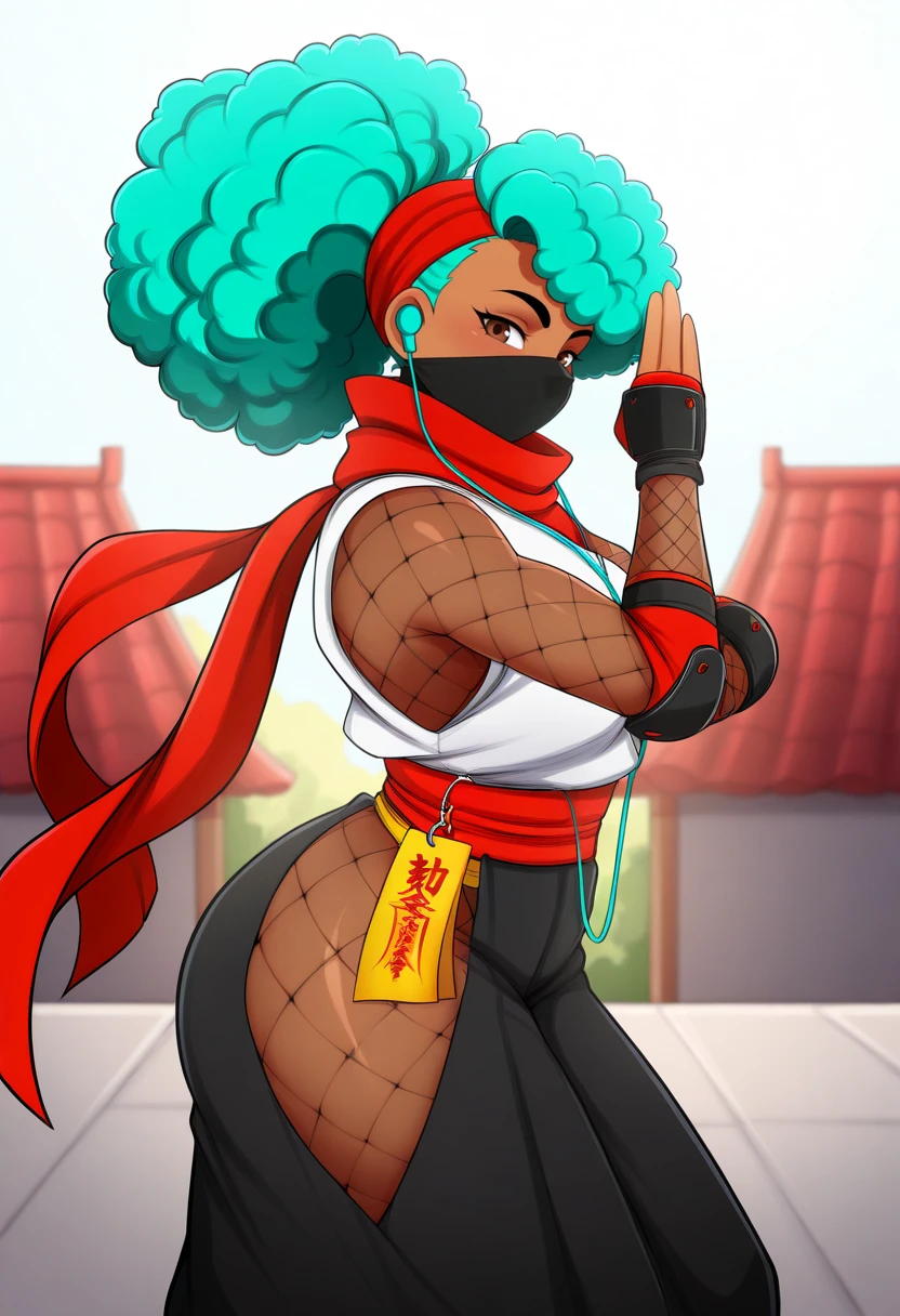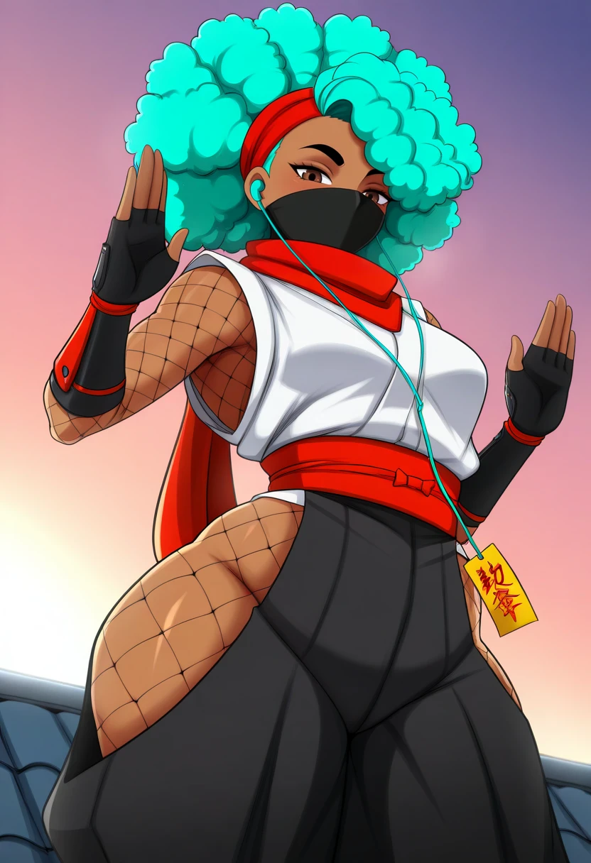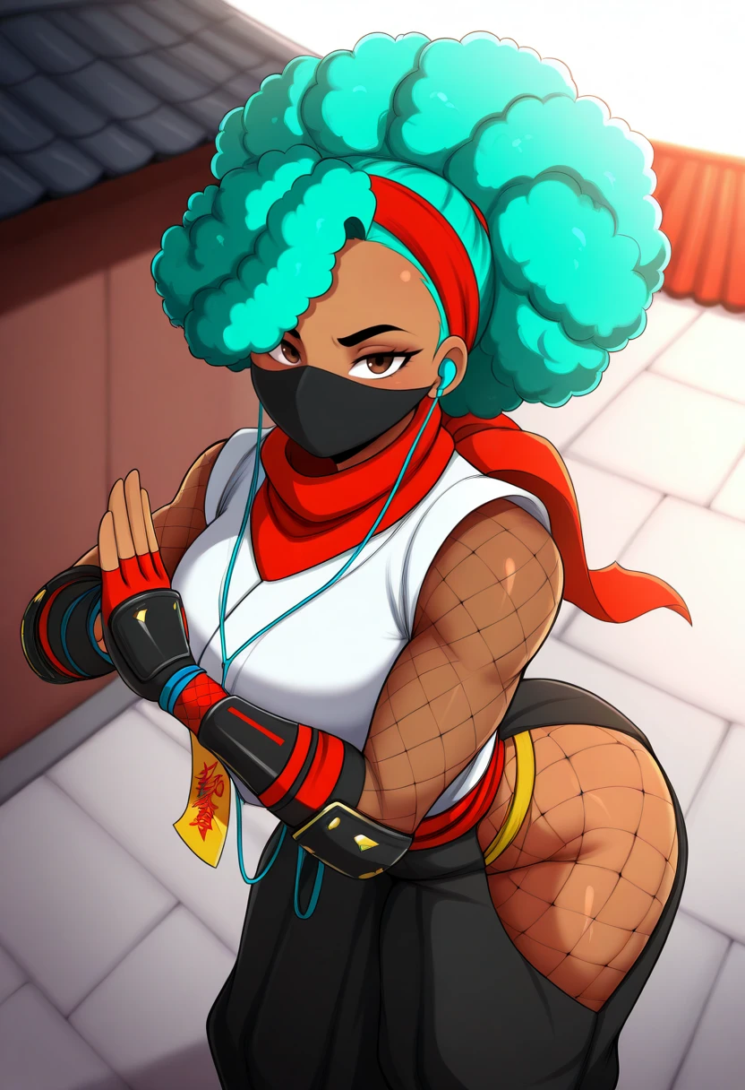 KimberlySF6IL,brown eyes,1girl,solo,looking at viewer,gloves,curly hair,japanese clothes,green hair,blackpants,fingerless gloves,armor,aqua hair,mask,fishnets,red scarf,mouth mask,ninja,japanese armor,hip vent,rooftop,ninja mask,fishnet bodysuit,talisman,white shirt,dark skin,red scarf,red hairband,hakama,earphones,ninja pose,sleeveless shirt,