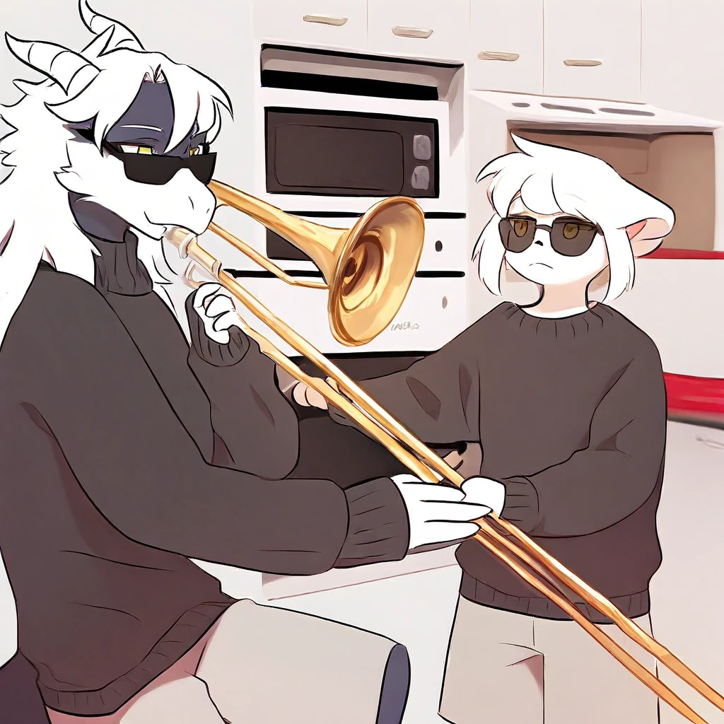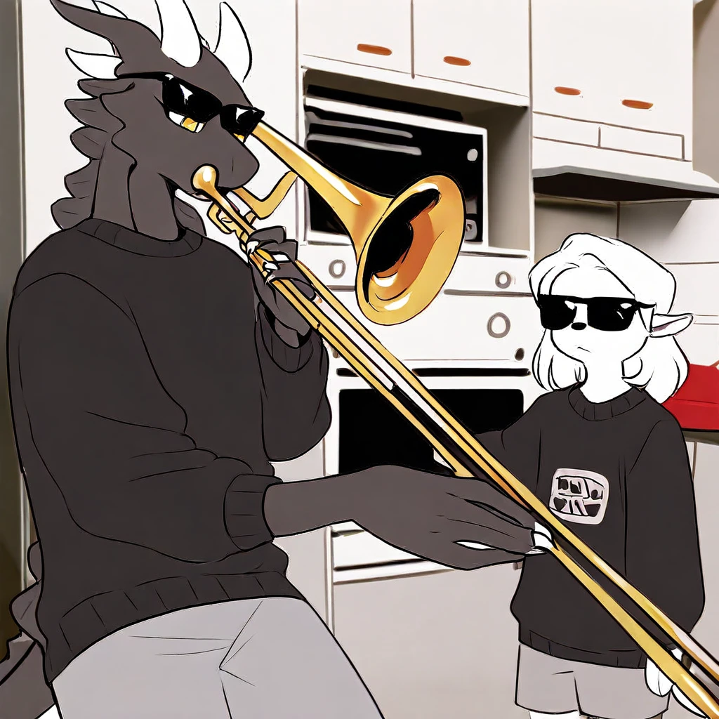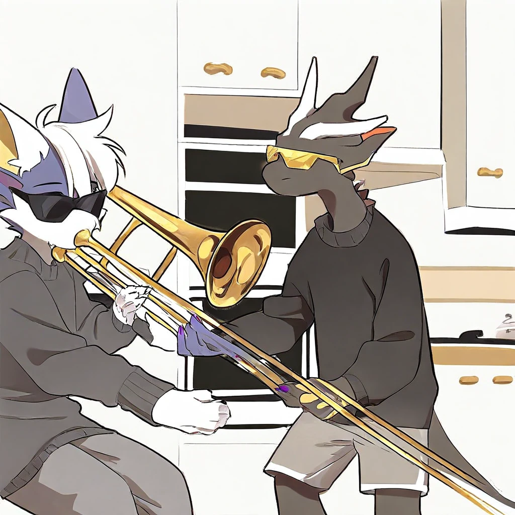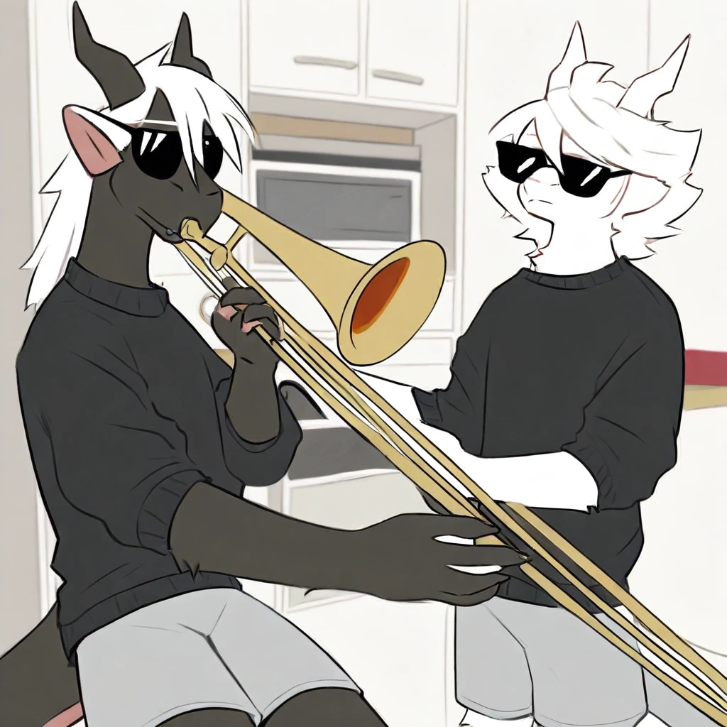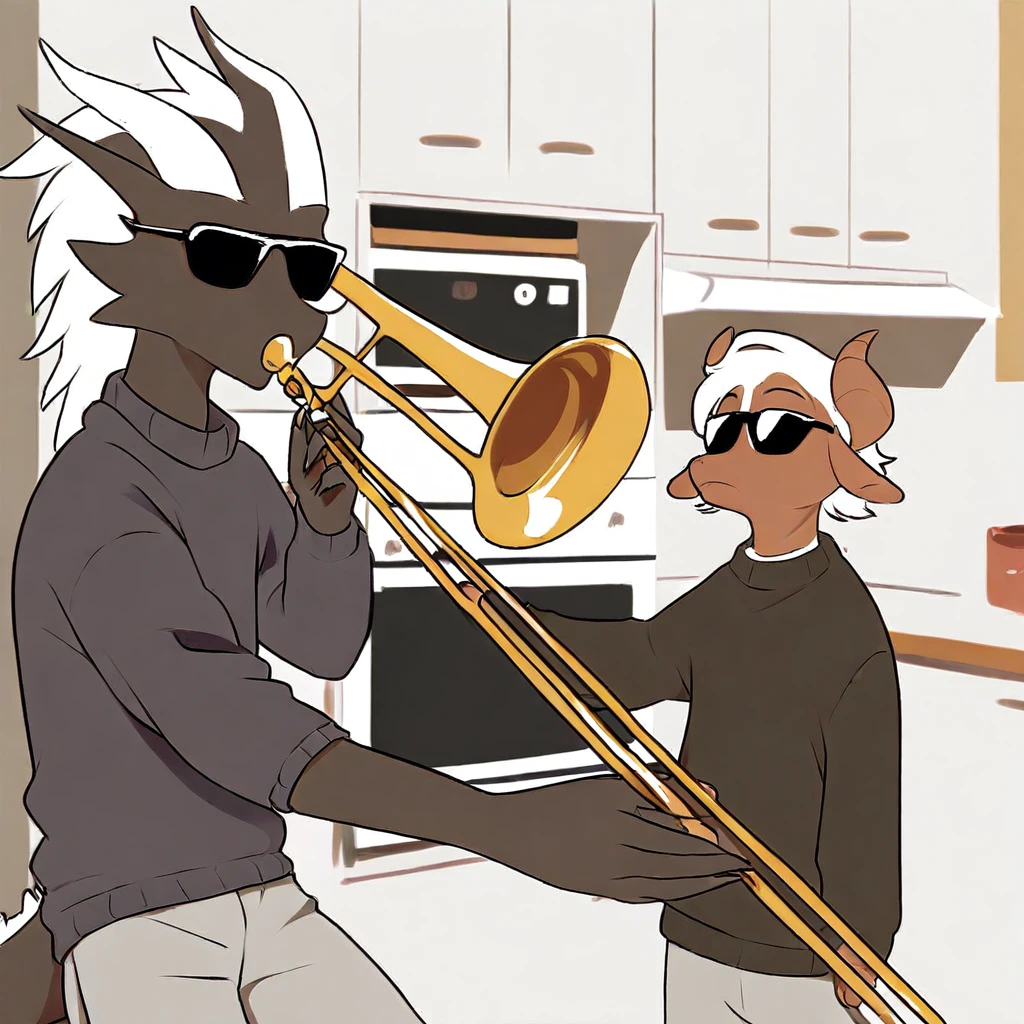 mikus-concept, playing instrument, music, sunglasses, indoors, trumpet, kitchen, duo