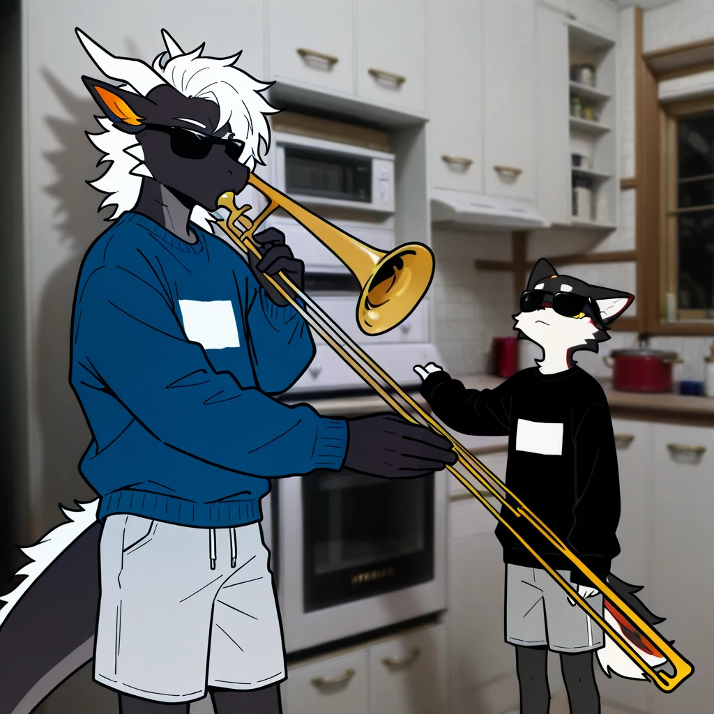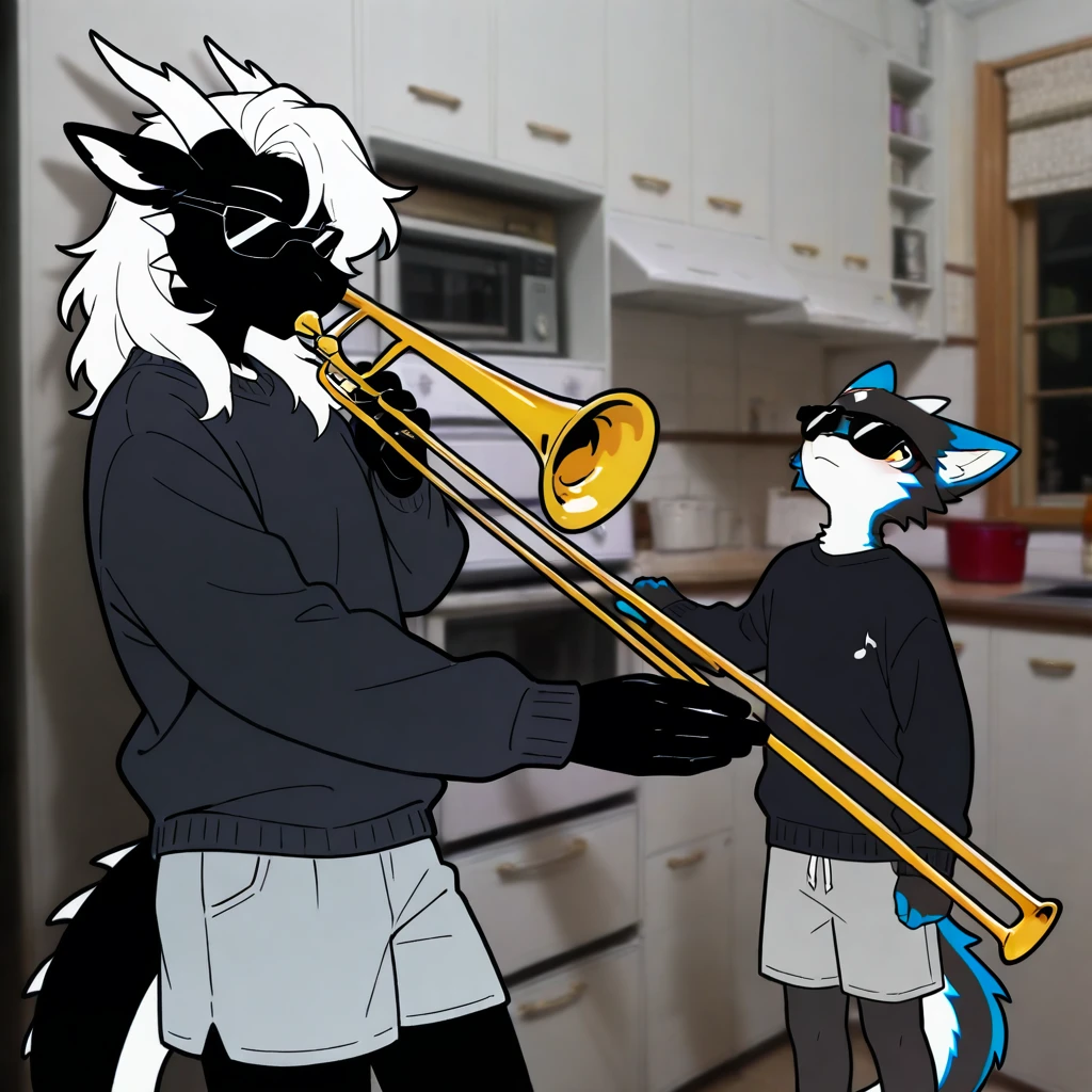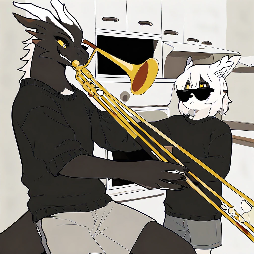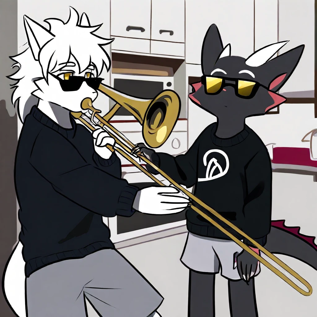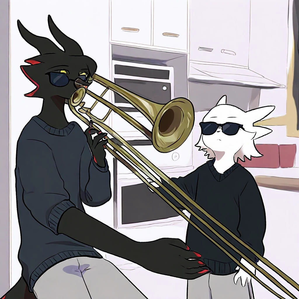 mikus-concept, playing instrument, music, sunglasses, indoors, trumpet, kitchen, duo