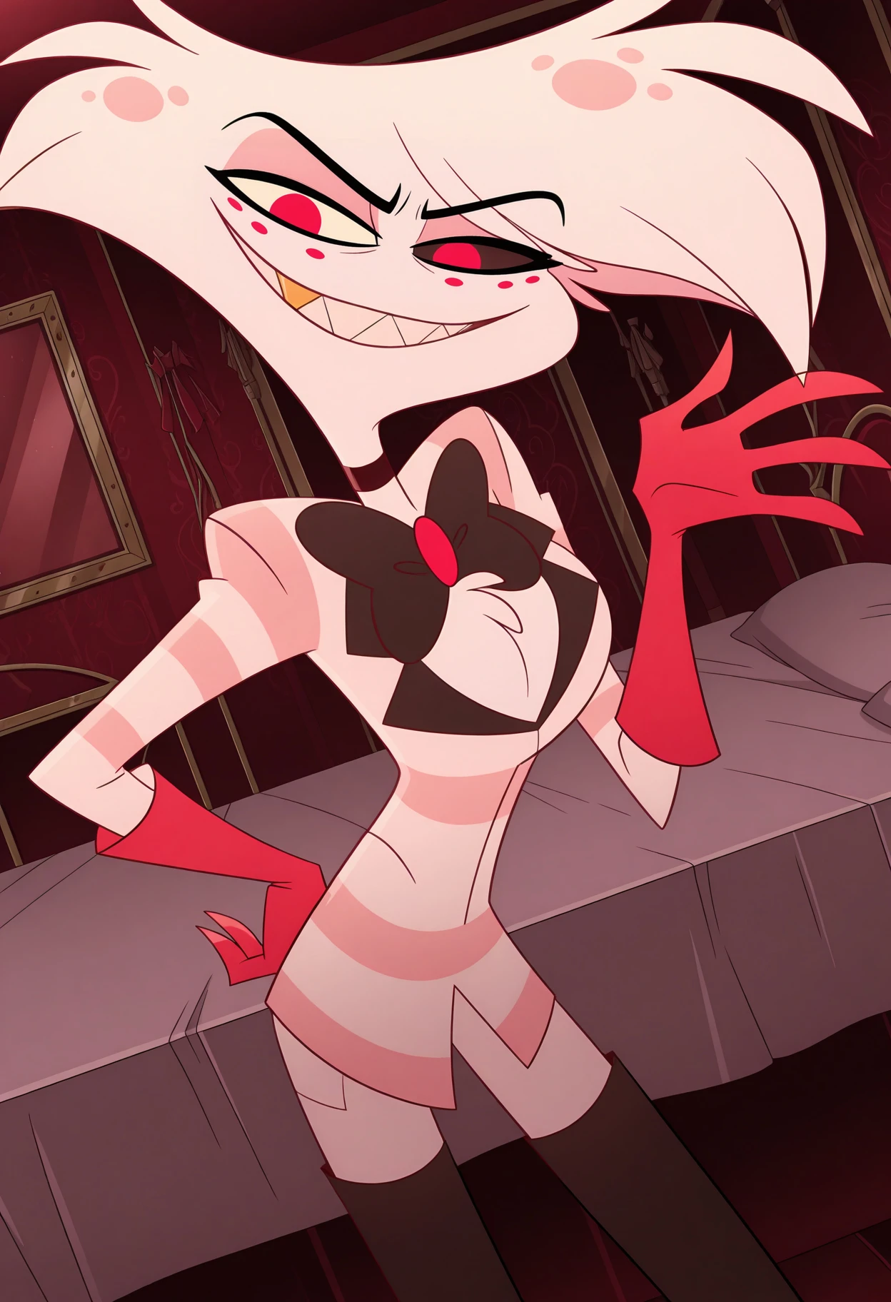 angel dust, \(hazbin hotel\), anthro, male anthro, male anthro spider, freckles, pink body, light pink fur, light pink body, colored sclera, black sclera, white sclera, no pupils, (4 fingers:1.2), choker, bowtie, striped suit, white suit, red gloves, thigh boots, black thighhighs