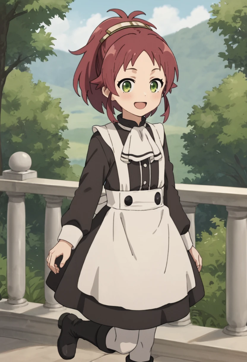 aisha greyrat,green eyes,red hair,ponytail,maid dress,long sleeves,(white pantyhose:0.8),black boots