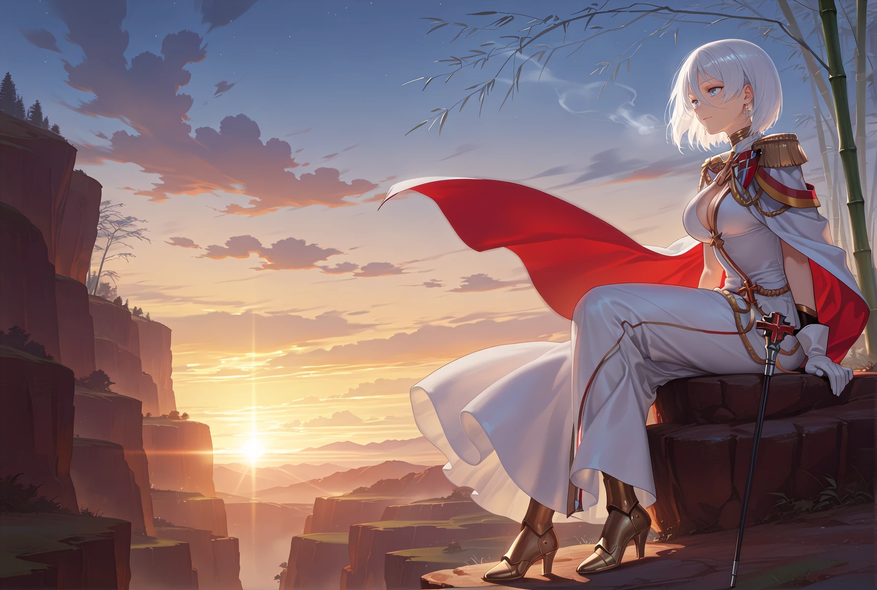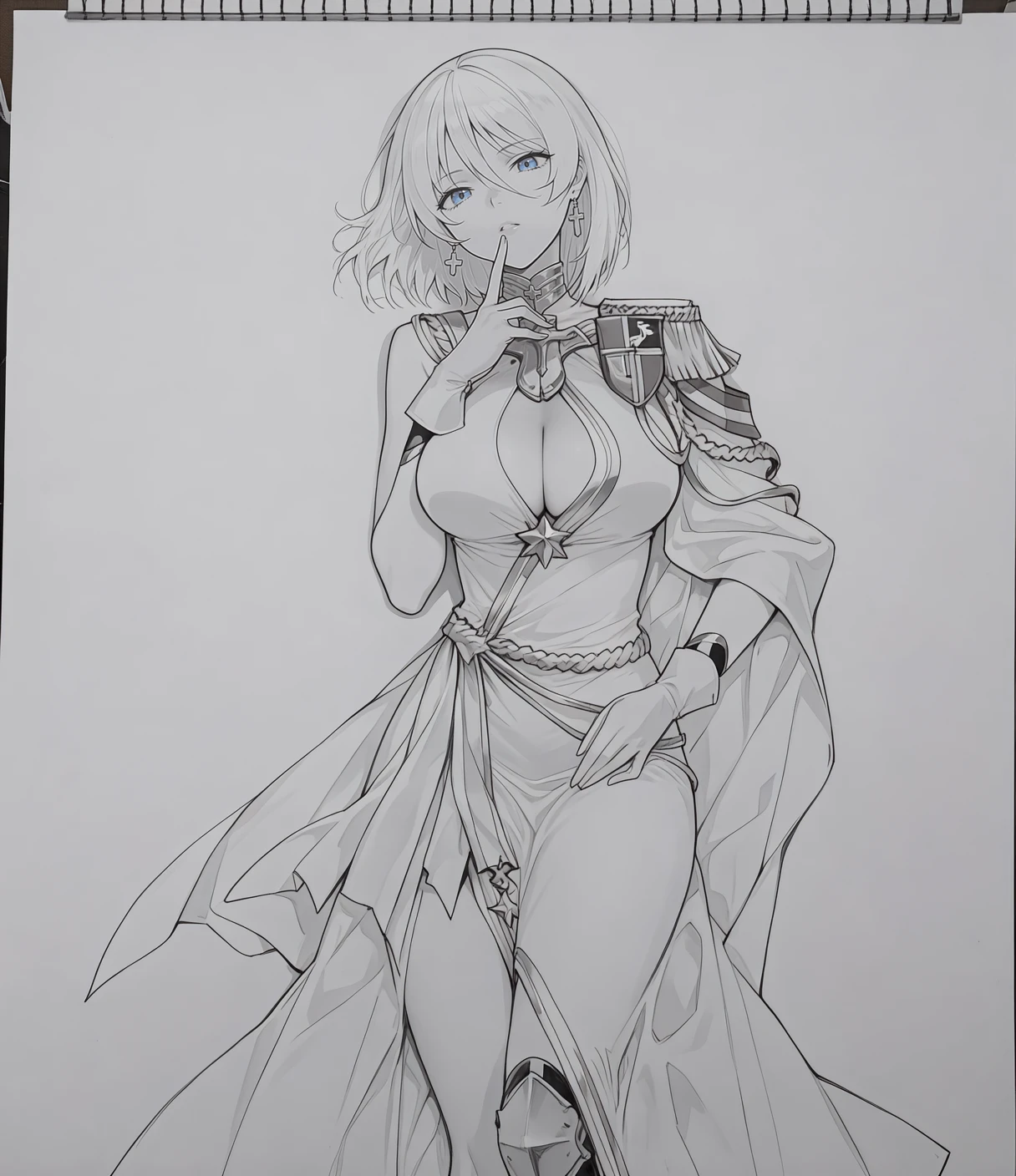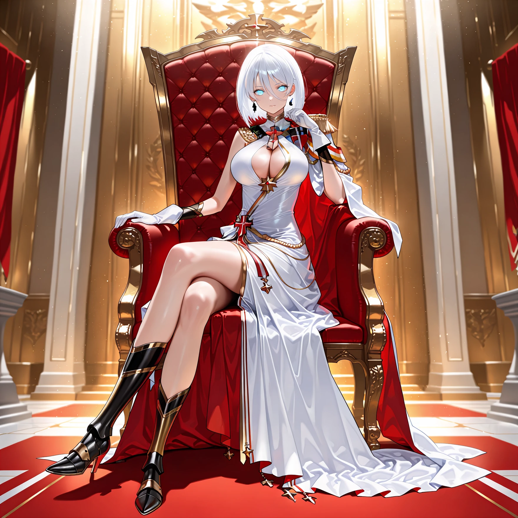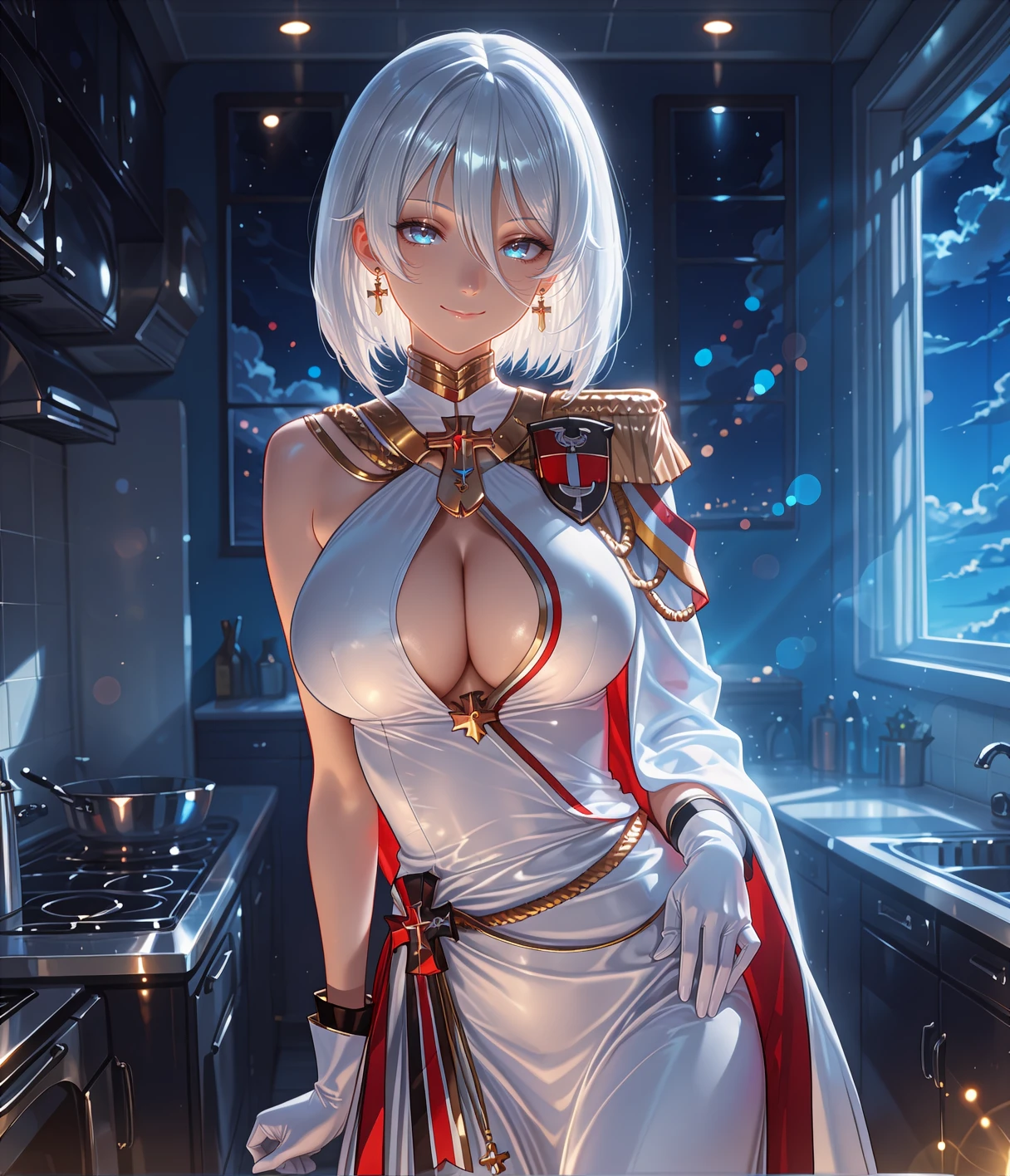 T0rpitzeve, blue eyes, white hair, medium hair, hair between eyes, cross earrings, large breasts, gold iron cross, high collar, two-sided fabric, cleavage cutout, white side cape, white dress, white gloves, emblem, aiguillette, single epaulette, long dress, asymmetrical clothes, jewelry, armored boots, black high heels, star ornament,